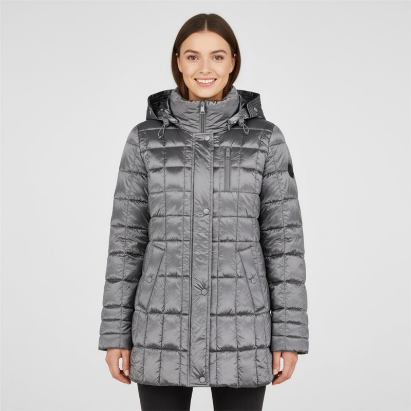 Abrigo acolchado para mujer. La capucha continua, el cuello alto y la cremallera oculta con tapeta de botones a presión ofrecen protección contra las inclemencias del tiempo, mientras que los múltiples bolsillos con cremallera y broches añaden funcionalidad para el día a día.