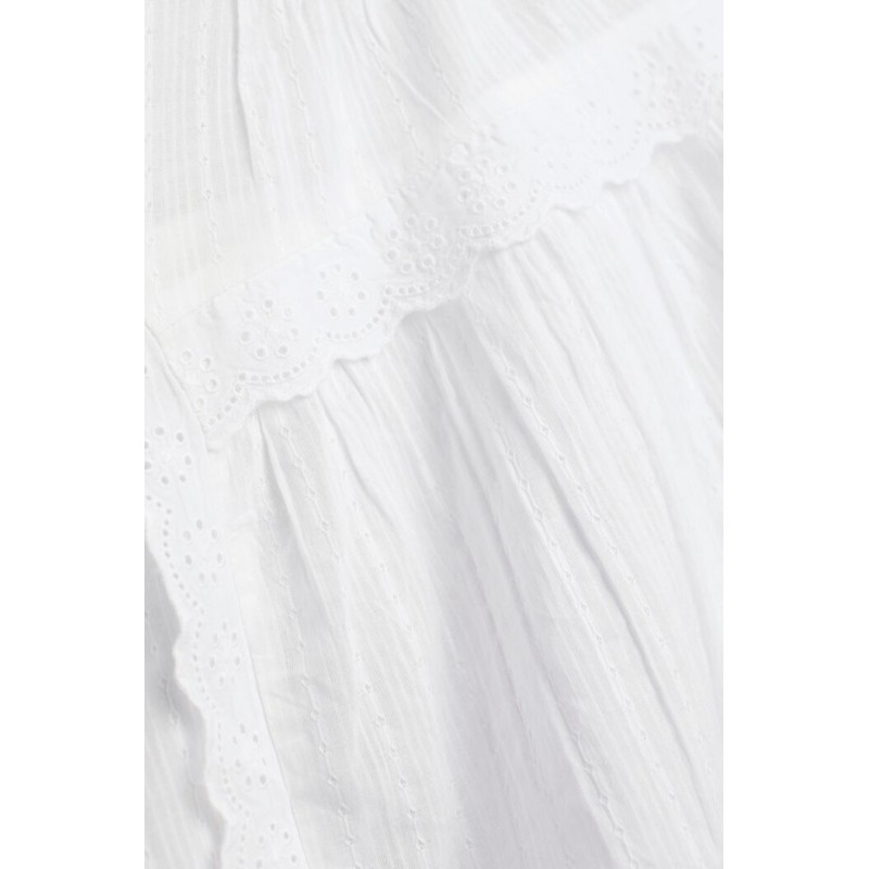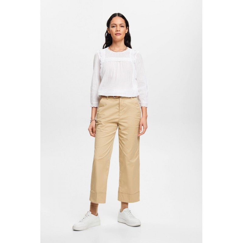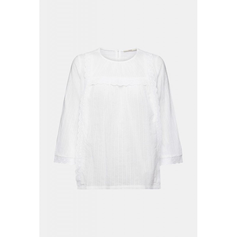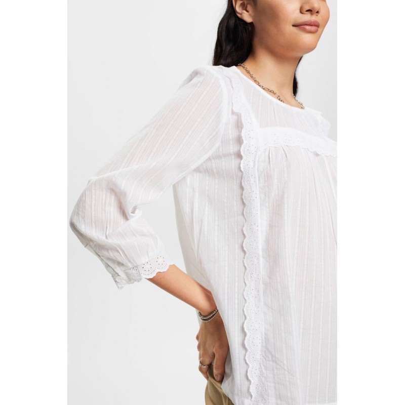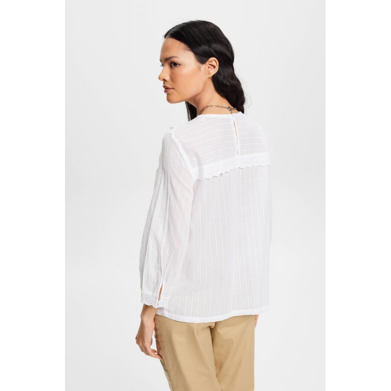 Esta blusa de encaje ligero está lista para la primavera. Está confeccionado con un tejido de algodón ligero para una sensación de brisa. Escote redondo con botón y lágrima en la espalda. Detalles de encaje festoneado y puños abotonado.