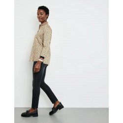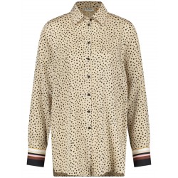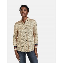 Blusa camisera de tejido fluido con estampado de topos. Tiene hermosos detalles como, los puños de colores y las largas aberturas laterales. Cierre de botones con tapeta. Ligeramente más largo en la espalda. Pliegue invertido en la espalda.