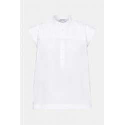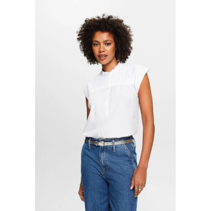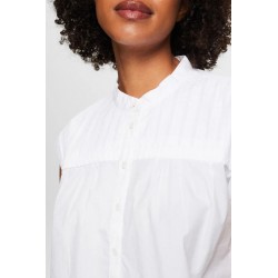 Blusa sin mangas para mujer de cuello alto, de costuras decorativas y cierre de tira semilarga de botones y fruncido por detrás.
