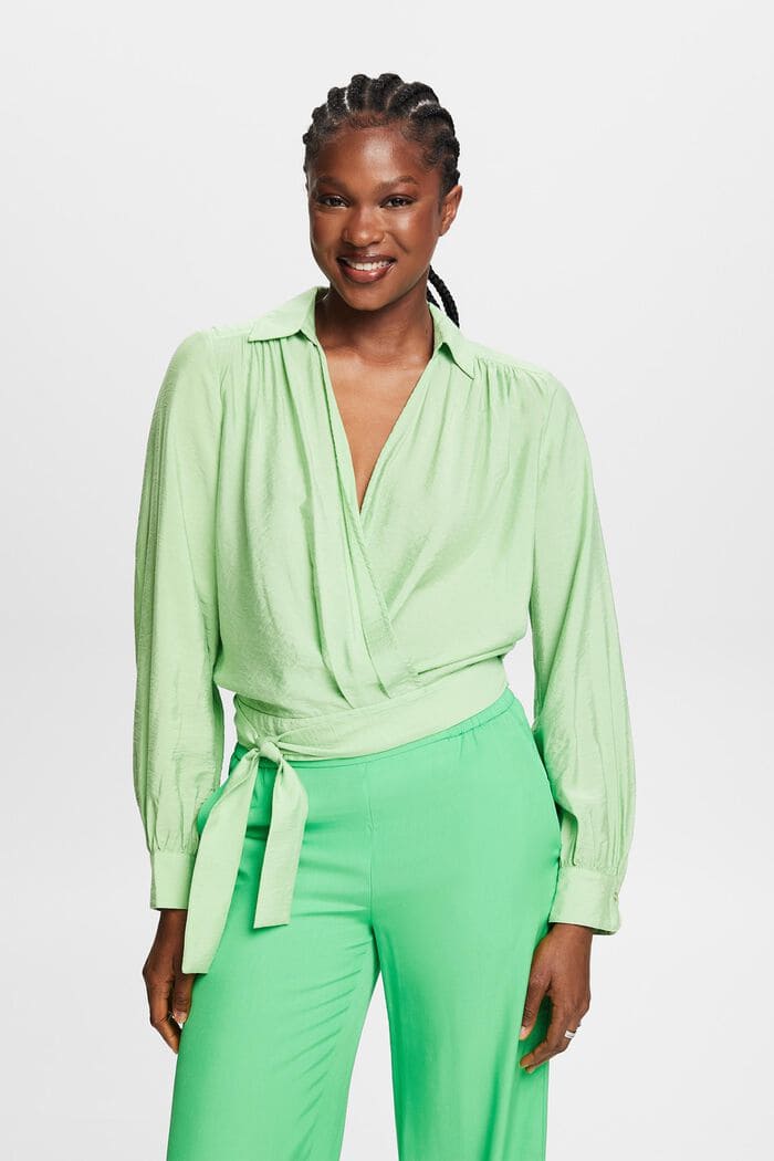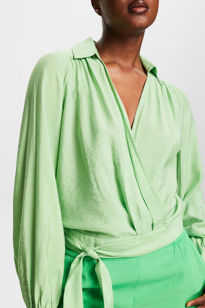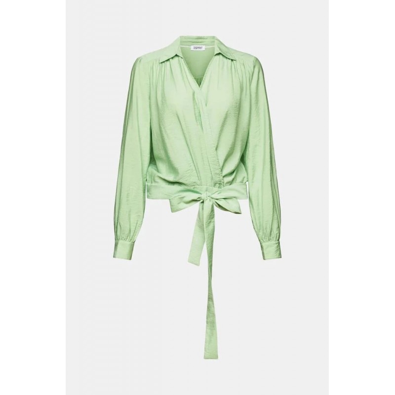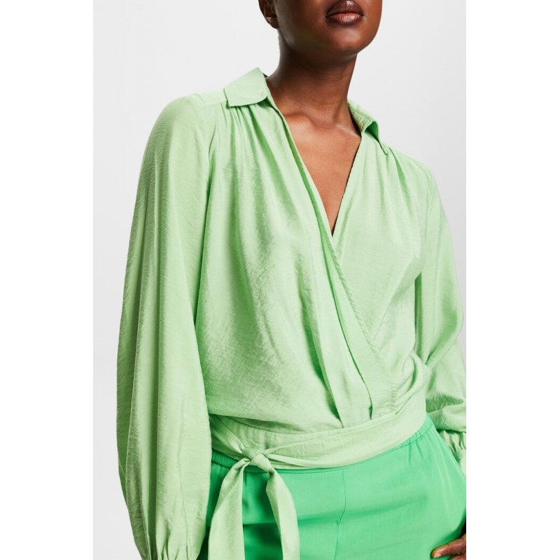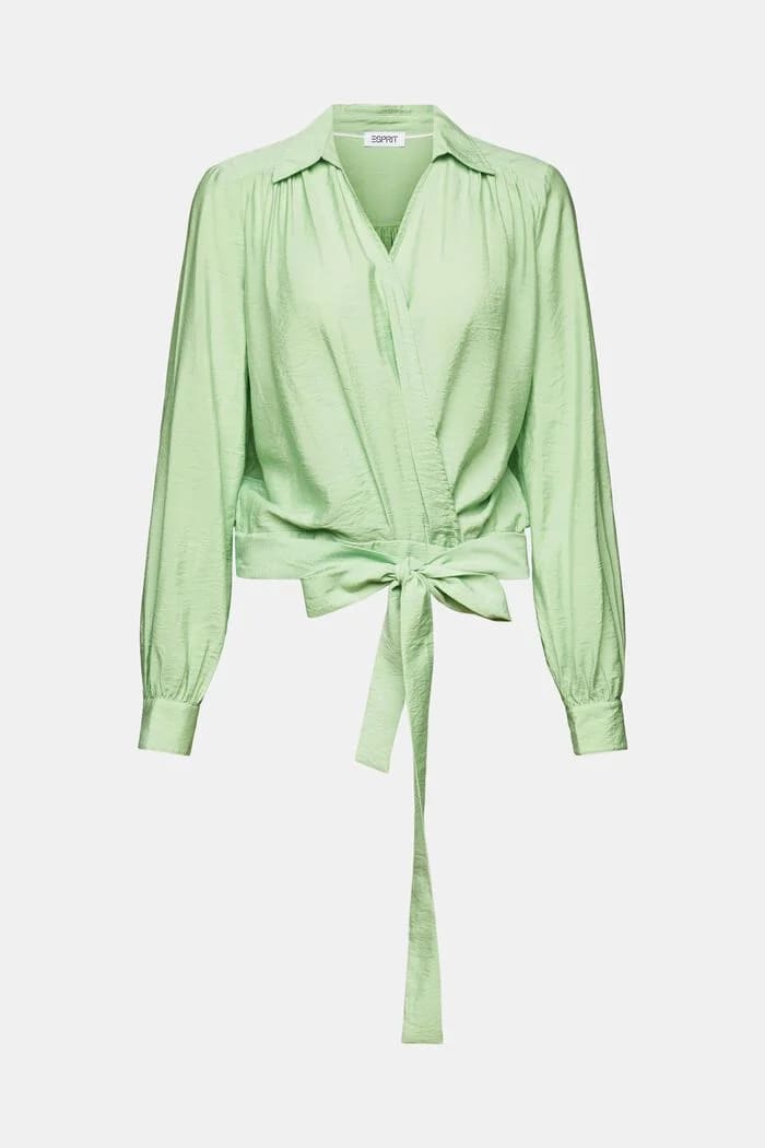 Blusa para mujer de cuello solapa, diseño cruzado que hacen un escote en forma de pico, cinta a juego para para hacer lazada y mangas largas de puños ribeteados y con botones.
