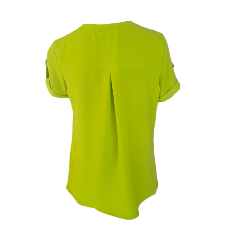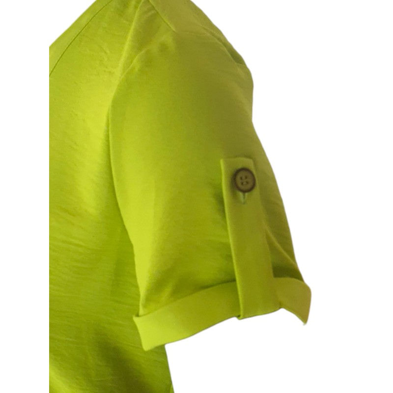 Blusa lisa ancha para mujer de cuello en "V" ribeteado con mangas cotas con dobladillo y tira para ajustar con botón.