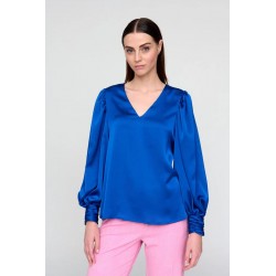 Blusa fluida lisa. Escote en V. Manga larga ligeramente abullonada con frunces en puños y hombros. Puño drapeado con cierre de tres botones joya y presillas. Bajo recto.