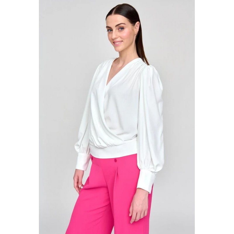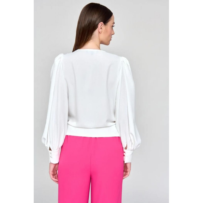 Blusa fluida lisa. Escote en V cruzado. Manga larga ligeramente abullonada acabada en puños ancho con cierre de doble botonadura. Bajo recto abullonado ajustado a la cadera.