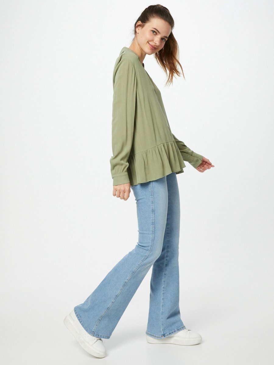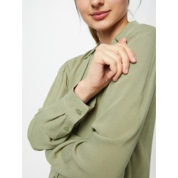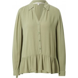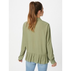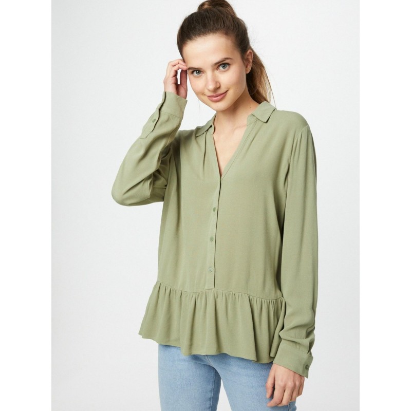 Blusa para mujer de cuello de solapa, escote en pico, cierre de botones, bajo con volantes y manga larga.