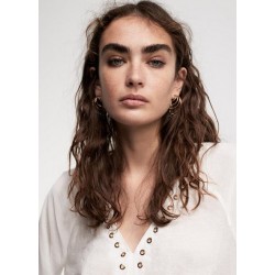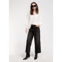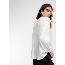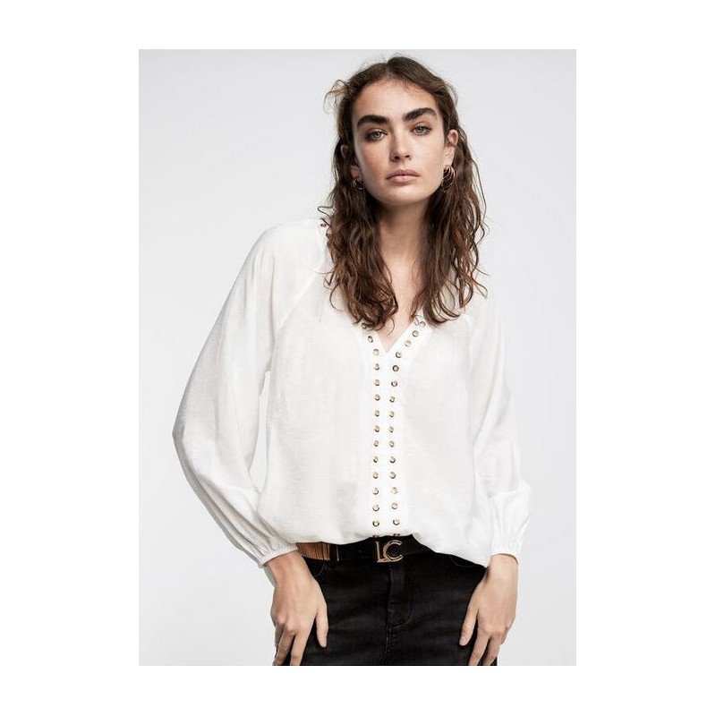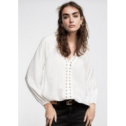 Blusa para mujer de detalles de ollados desde escote en pico hasta abajo, y mangas abullonadas con puños elásticos.