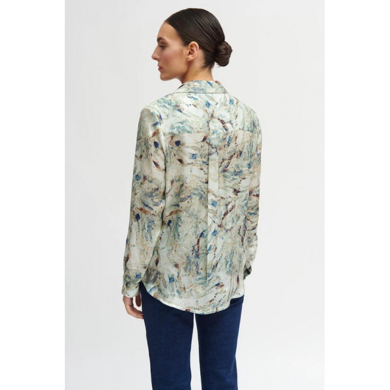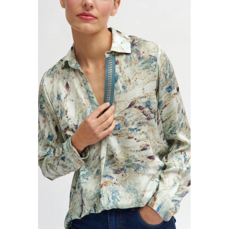 Blusa fluida estampada para mujer.Tejido suave y ligero. Cuello camisero con escote en V y detalle de cinta a contraste. Corte recto. Manga larga acabada en puño con cierre de botón. Pliegue frontal. Canesú doble en la espalda. Bajo ligeramente redondeado.