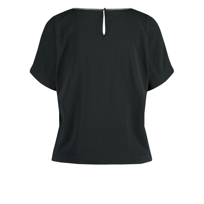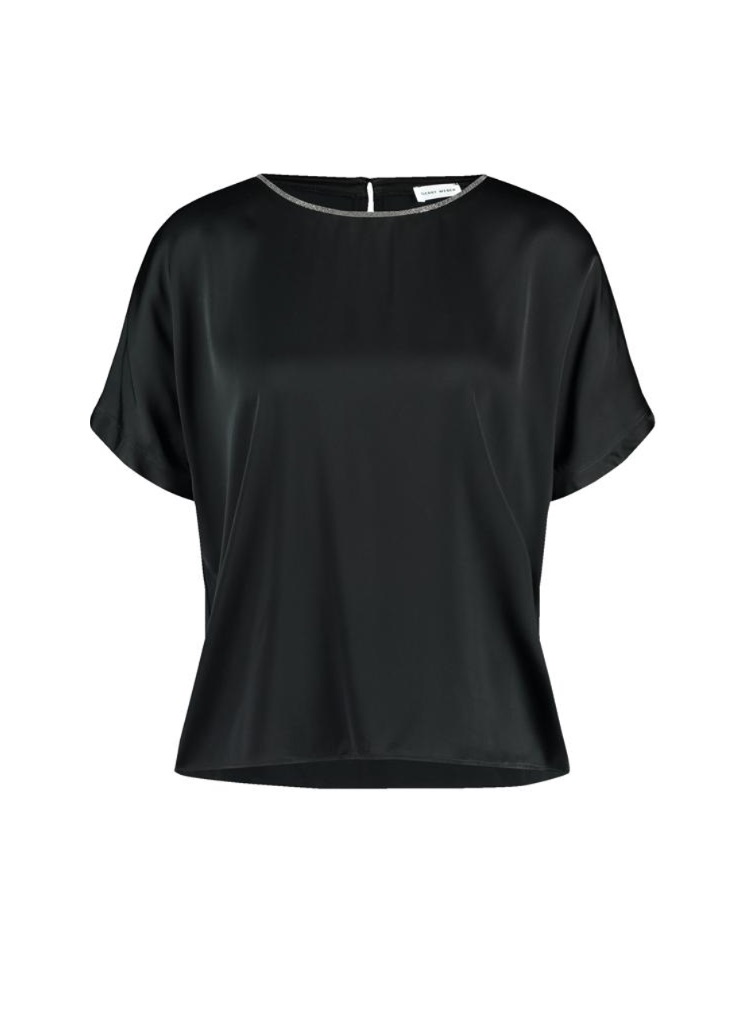 Blusa con ribete brillante en el escote para mujer.Cierre de botones en la espalda. Tejido fluido. Manga corta, hombros caidos. Cuello redondo con pequeña abertura en la espalda.
