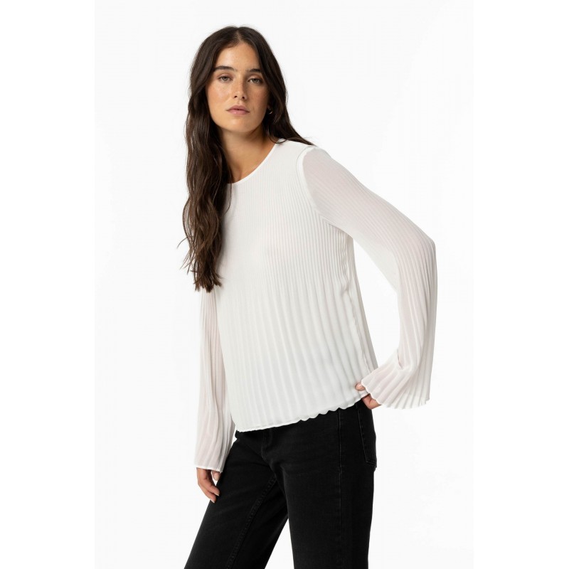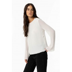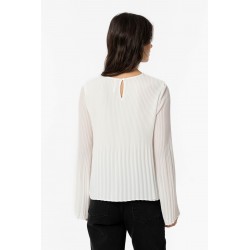 Blusa basica plisada para mujer.Cuello redondo. Manga larga. Cierre trasero con botón.