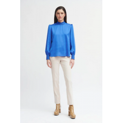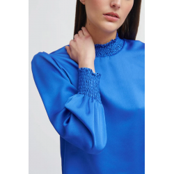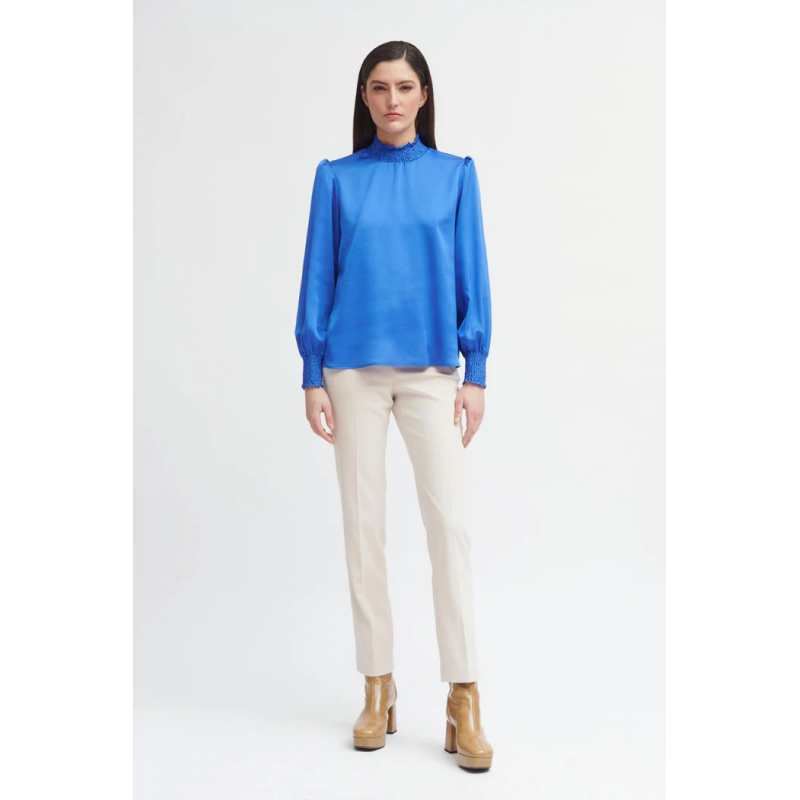 Blusa lisa para mujer.Tejido suave y fluido. Cuello redondo cerrado en nido de abeja. Corte recto. Manga larga ligeramente abullonada con puño elástico en nido de abeja. Bajo recto.