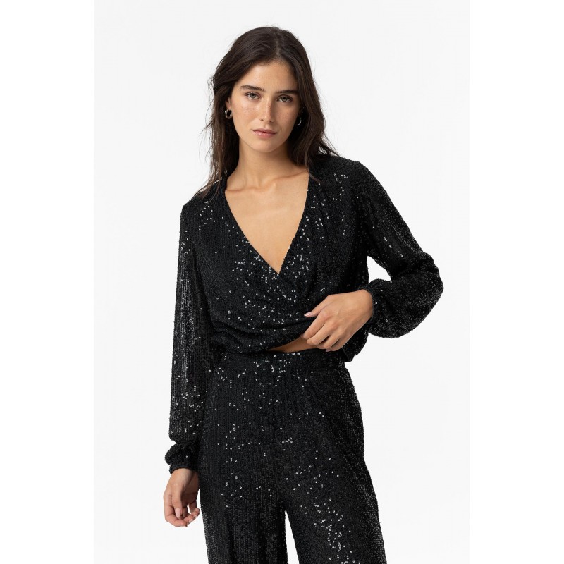 Blusa brillo con cuello en V para mujer. Manga larga y remates elásticos en bajo y puños.