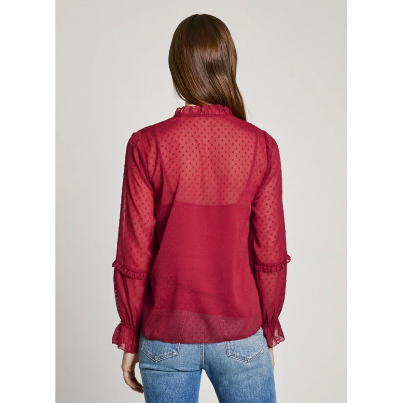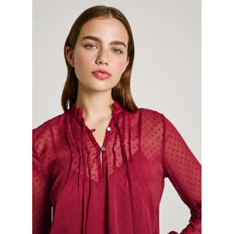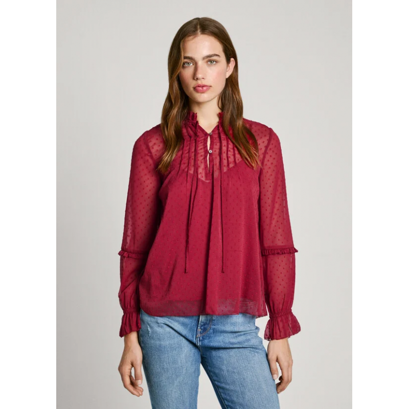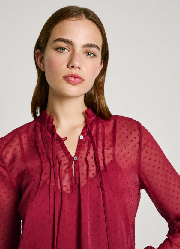 Blusa en tejido plumeti semitransparente para mujer. Cuello mao con mini volantes. Media tapeta con cierre de botones y cordón ajustable. Manga larga con volantes en la mitad. Puños elásticos con volantes.Camisola interior con tirantes ajustables.