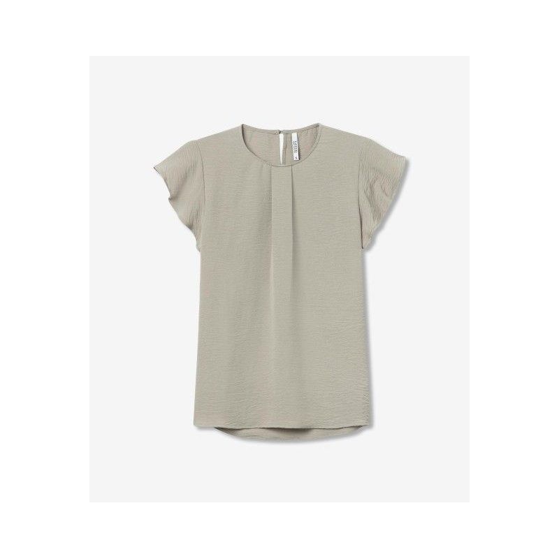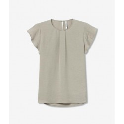 Blusa de manga corta para mujer. Con detalles de volantes. Cuello redondo. Cierre trasero con botón.