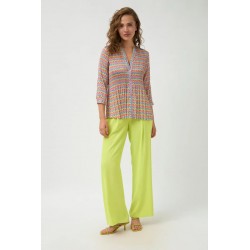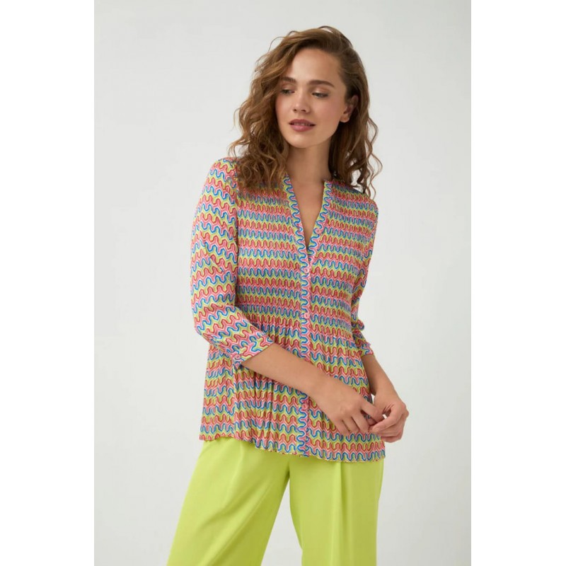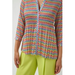 Blusa fluisa plisada de estampado geométrico para mujer, cuello redondo con escote en pico, cierre frontal de botones efecto nácar, bajo recto y manga larga de puño con cierre de botón.