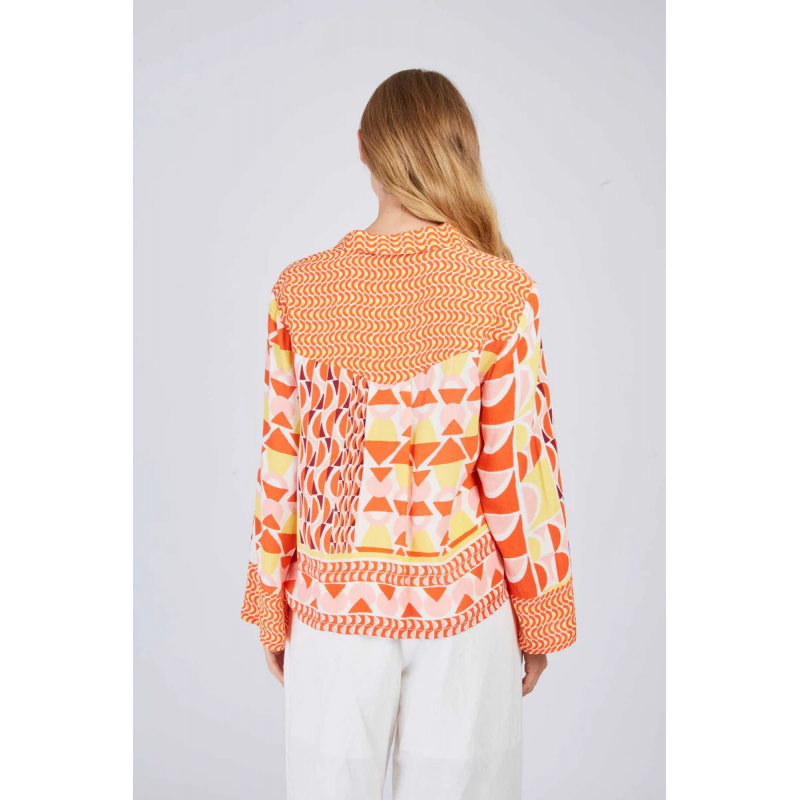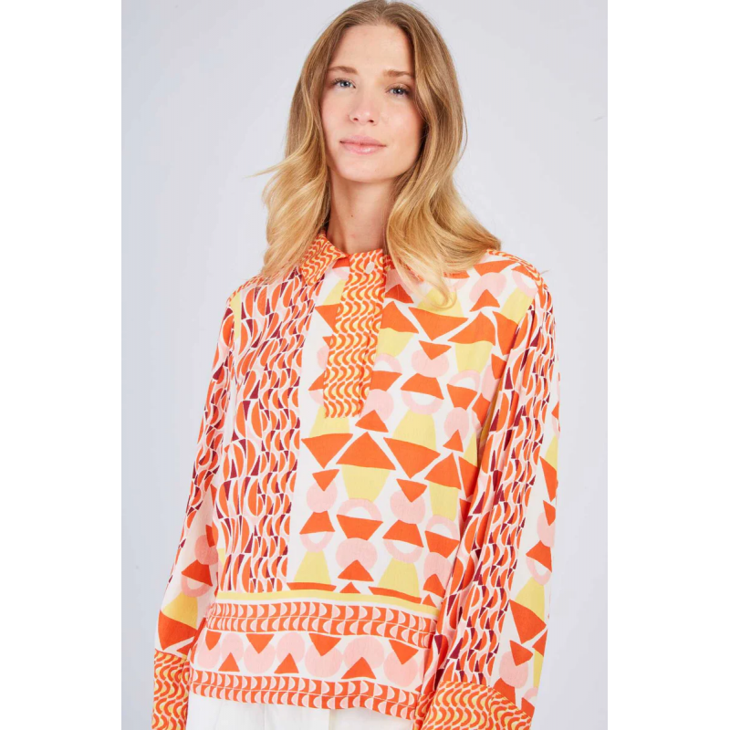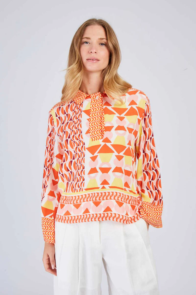 Blusa estampada para mujer.Manga larga. Escote redondo sencillo. Estampado geométrico multicolor. Mangas acampanadas con ribete en contraste. Ajuste recto y holgado que ofrece una comodidad óptima. Esta pieza aportará un toque de originalidad y alegría a tu armario.