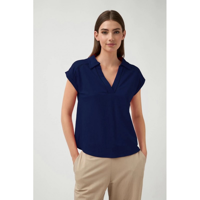Blusa dobladillo para mujer de Diseño recto, cuello camisero con escote en V y detalle calado en costura más manga corta con dobladillo y detalle de línea calada.