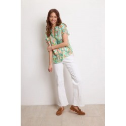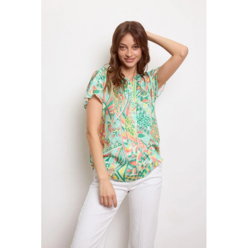 Blusa estampada para mujer de cuello redondo con escote en V. Cierre frontal con botones. Manga corta. Canesú trasero con pliegue central. Bajo recto ligeramente más largo en la parte trasera.