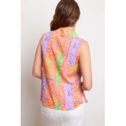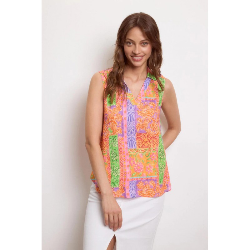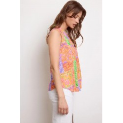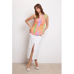 Blusa fluida sin mangas con estampado paisley. Diseño recto suelto. Tejido suave y ligero. Escote pico. Bajo recto con aberturas laterales ligeramente más largo en la parte trasera.
