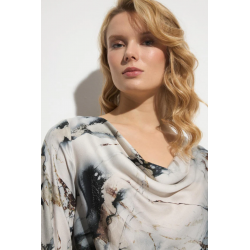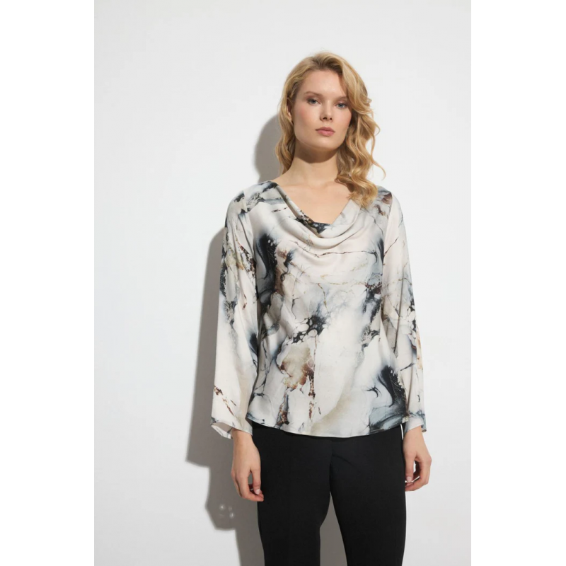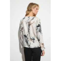 Blusa fluida estampada para mujer. Escote drapeado. Diseño recto y ancho. Manga larga fluida ancha. Bajo ligeramente redondeado.