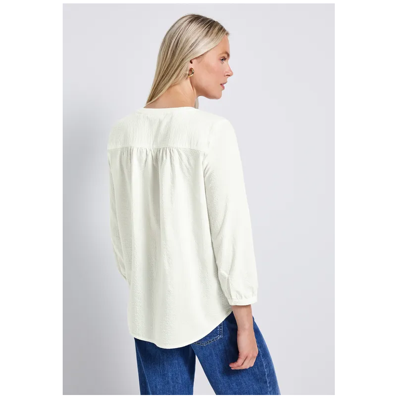 Camisa basica para mujer. El cuello redondo con abertura y tapeta de botones y las mangas 3/4 con botones crean un look relajado y moderno. El tejido texturizado de seersucker es agradablemente vaporoso.