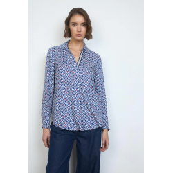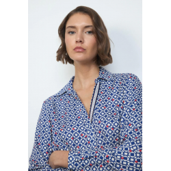 Blusa estampada para mujer. Cuello camisero con escote en V y detalle de cinta interior estampada. Diseño recto holgado. Manga larga acabada en puño con botón. Bajo recto.