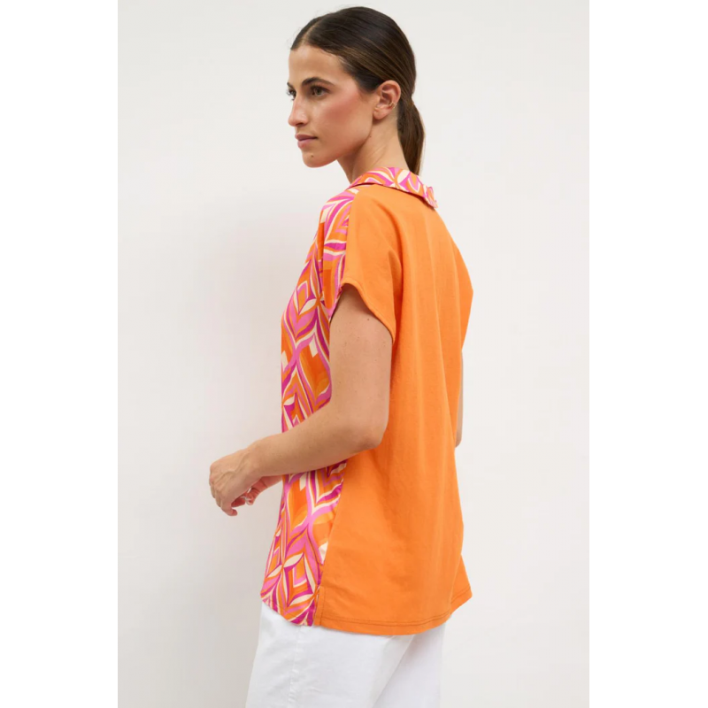 Blusa estampada para mujer. Manga corta. Cuello camisero abierto. Estampado psicodélico.Corte recto. Bajo con pequeñas aberturas laterales.