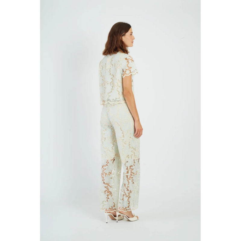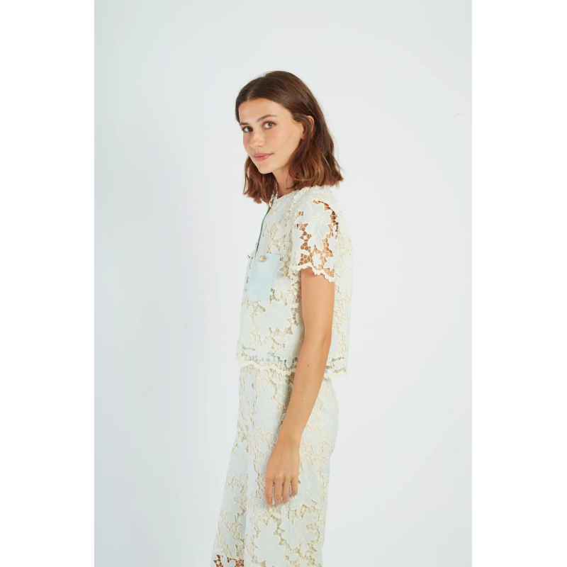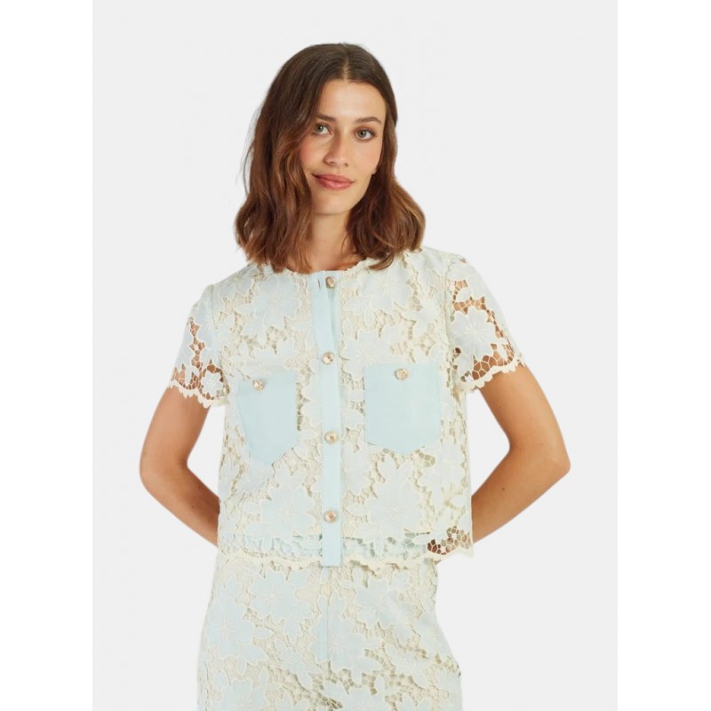 Blusa corta de encaje floral con un delicado y femenino estampado. Manga corta y escote redondo. Corte recto ligeramente cropped que favorece la figura. Cierre de botones en la parte delantera para un acabado impecable. Ideal para un look chic.