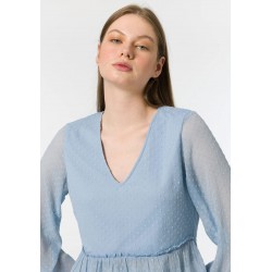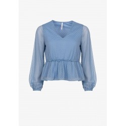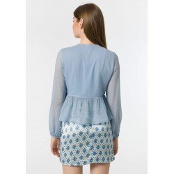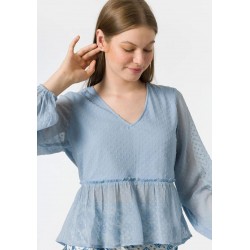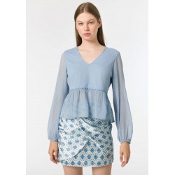Blusa fruncida para mujer con escote en forma de pico y detalles fruncidos en sus manga largas con elástico en puño.