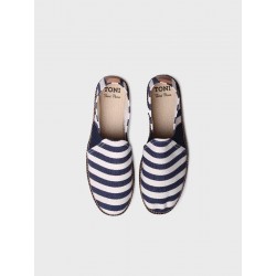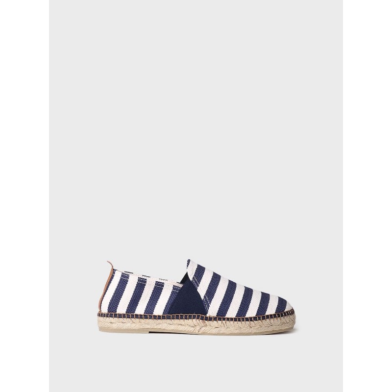 Esta alpargata para hombre se elabora en tejido en tonos rayados. La suela exterior es de yute. La base de la suela es de goma antideslizante y la planta está forrada en tejido de algodón. La unión del tejido y la suela está cosida a mano con un hilo de algodón. Las gomas laterales hacen que se adapte perfectamente al pie.