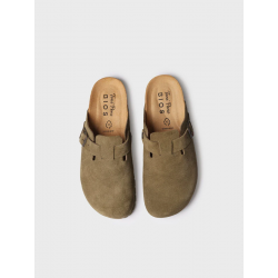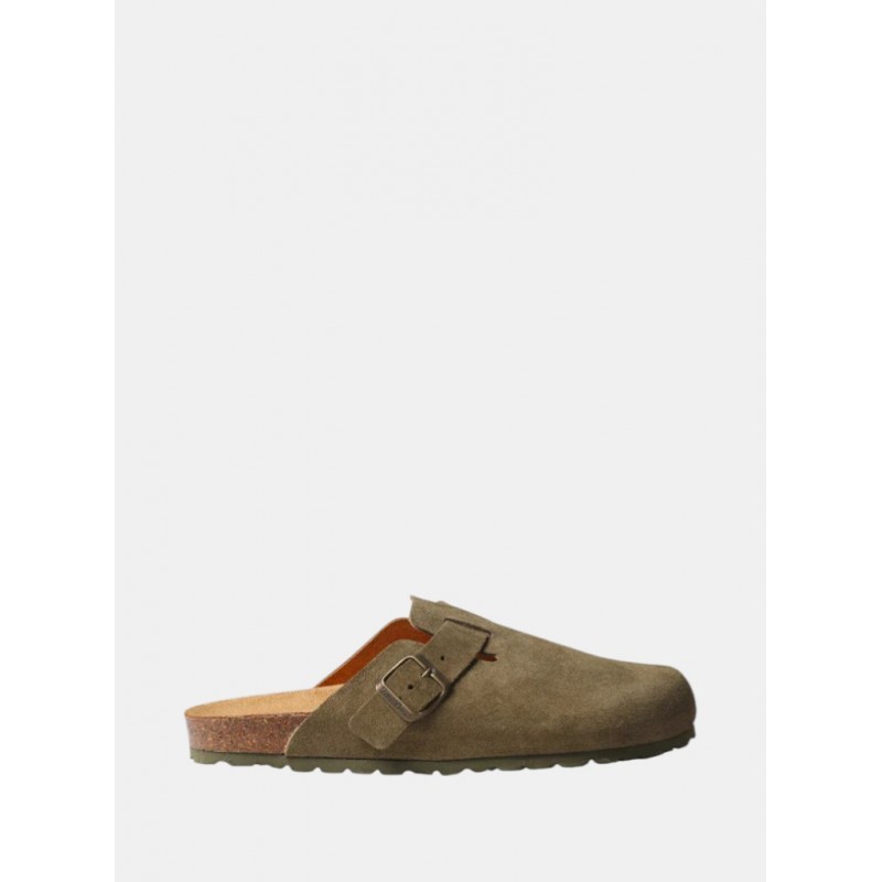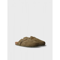 Zueco para hombre elaborado en serraje. Cuenta con una tira con una hebilla para asegurar un perfecto ajuste al pie. La planta interior está forrada en serraje acolchado para mayor confort. La suela es de corcho y goma EVA y tiene una altura de 2,5 cm.