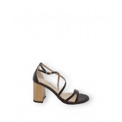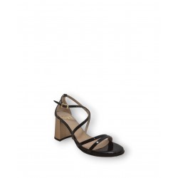 Sandalia para mujer de charol con diseño de tiras finas hasta el tobillo, cierre de hebilla y tacón a contraste.