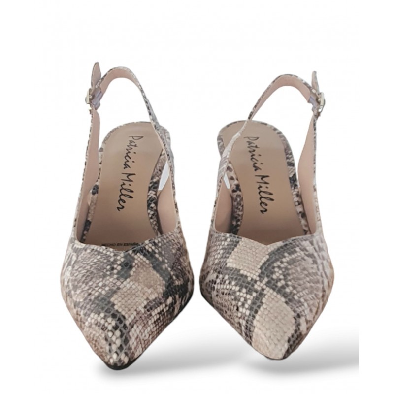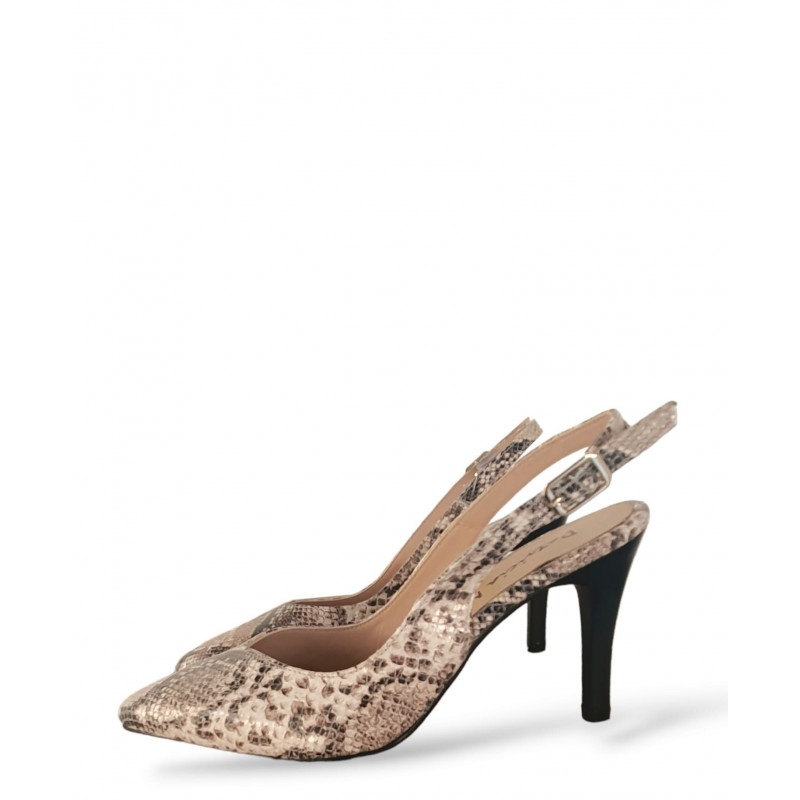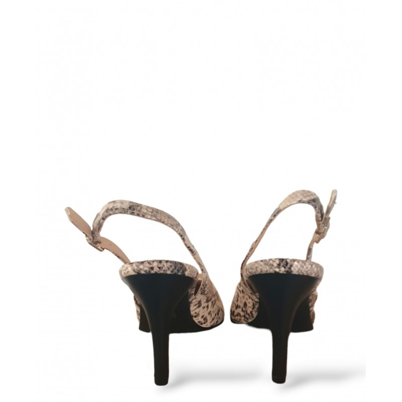 Calzado destalonado con cierre de hebilla y suela de goma. Estampado de serpiente. Tacón fino de 6,5 centímetros.