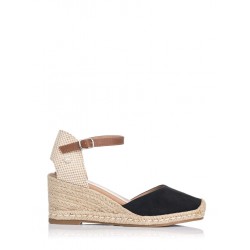 Zapato de mujer con cuña tipo valenciana, de la marca Xti. Fabricada en tres tipos de materiales distintos, siendo la puntera antelina, la trasera lona y el cierre, mediante tira y hebilla, de material que imita la piel. Cuña de 7 cm de yute con suela de goma antideslizante. Este modelo ha obtenido el certificado vegano por la organización mundial PETA (Organización de los derechos de los animales).