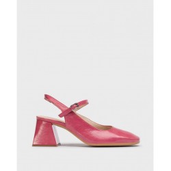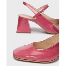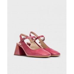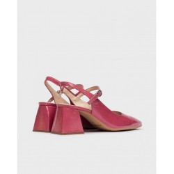 Sandalia destalonada en piel acharolada roja. El modelo tiene la punta cuadrada y una tira decorativa en el empiene. El ajuste es perfecto gracias a una tira elástica al tobillo, el tacón tiene la altura perfecta de 6 centimetros. Disfruta de comodidad garantizada gracias a la plantilla MemoryGel.