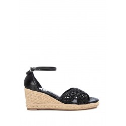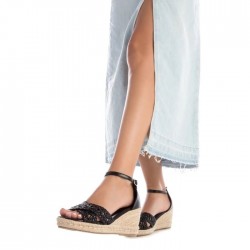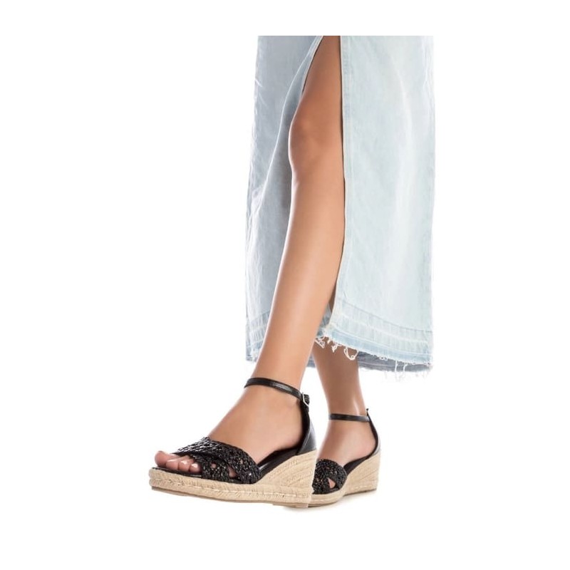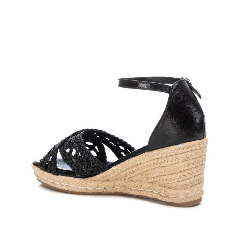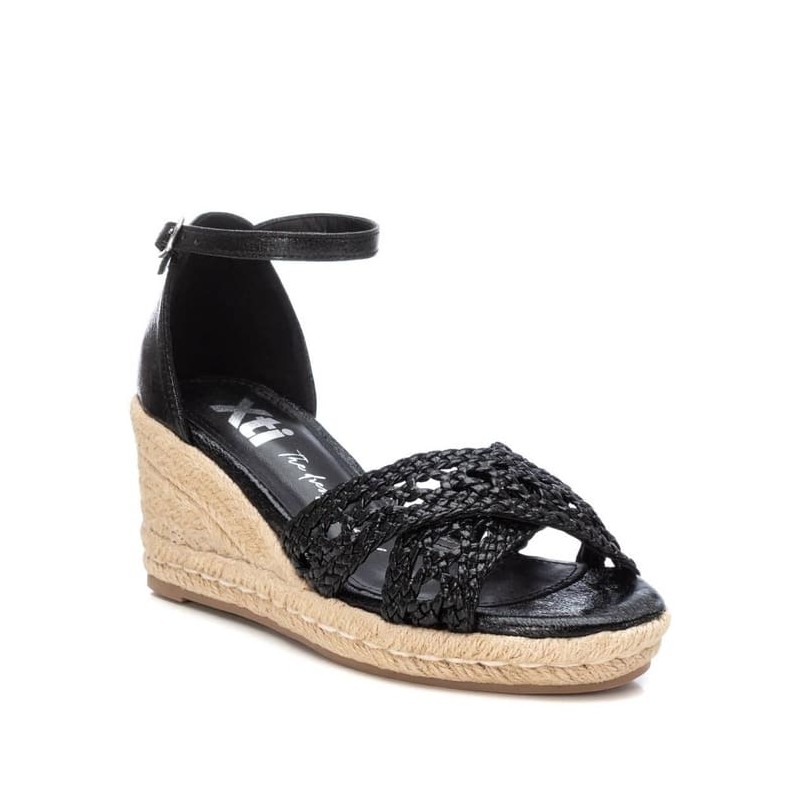 Sandalia de mujer, de la marca Xti. Fabricada en material que imita la piel con acabado metalizado. Diseño de pala cruzada y pulsera en el tobillo con hebilla metálica. Suela antideslizante. Cuña 8 cm. Este modelo ha obtenido el certificado vegano por la organización mundial PETA (Organización de los derechos de los animales).