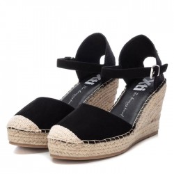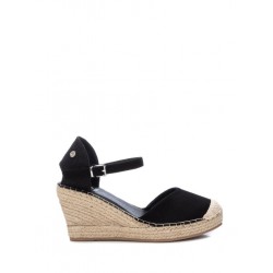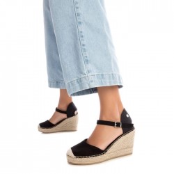 Sandalia de cuña fabricada en suave antelina. Cuña de 8 cm forrada en yute con suela de goma antideslizante. Cierre con hebilla.