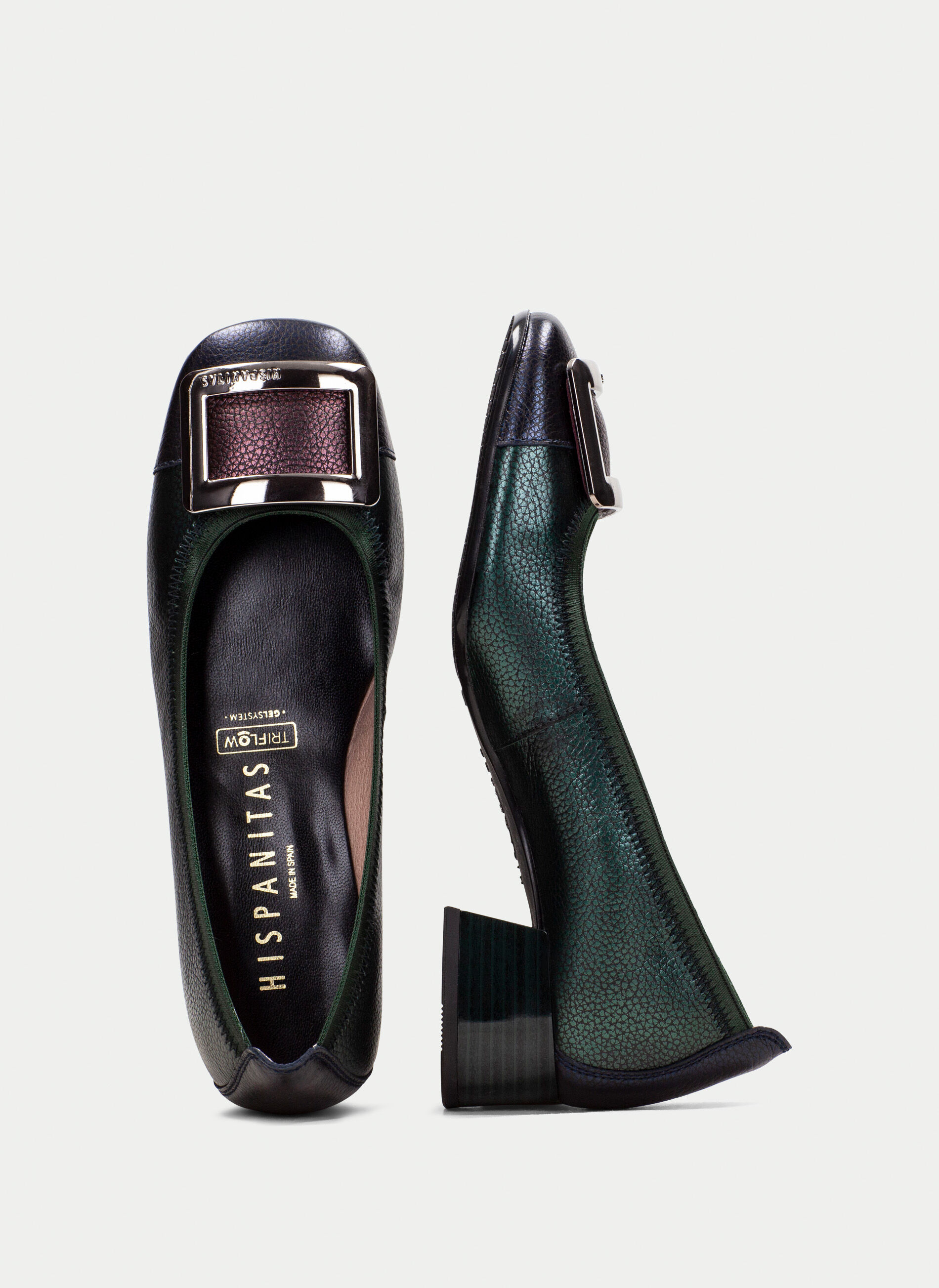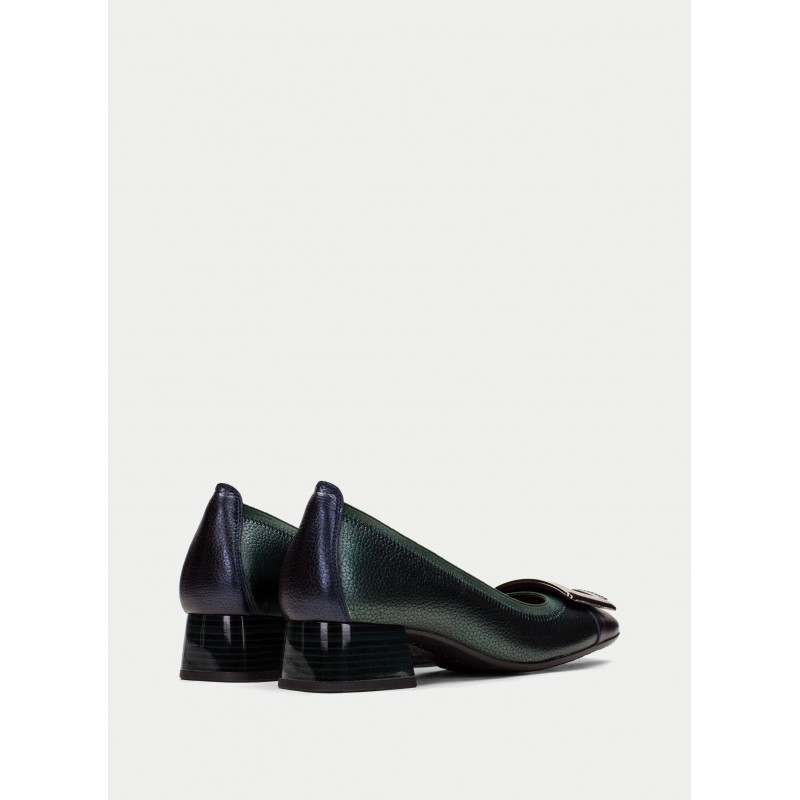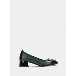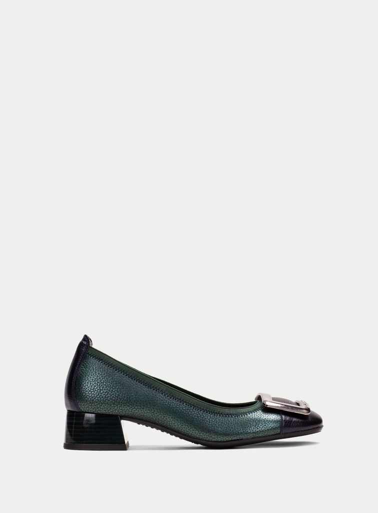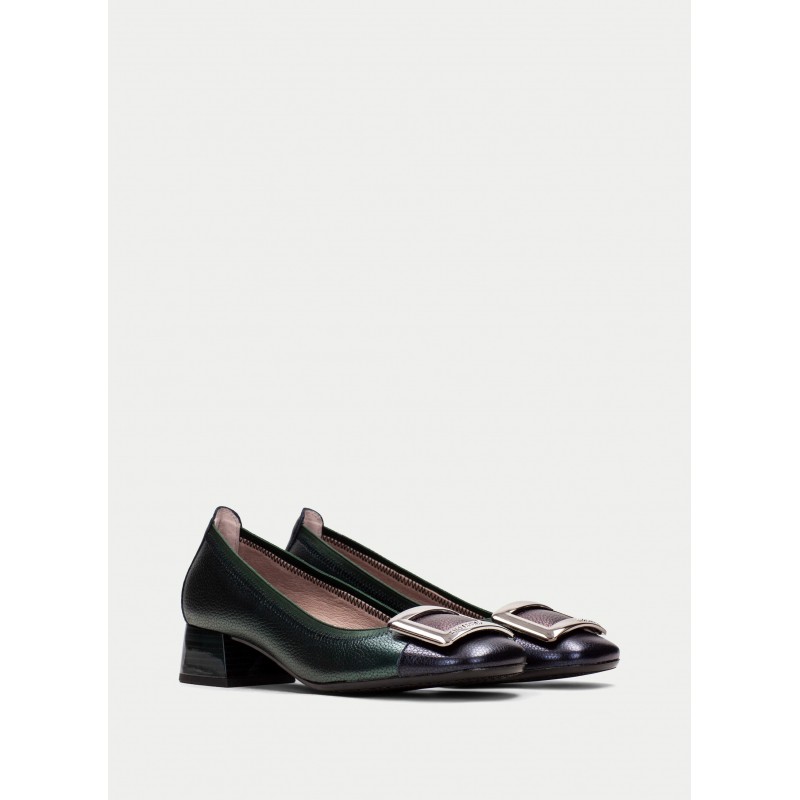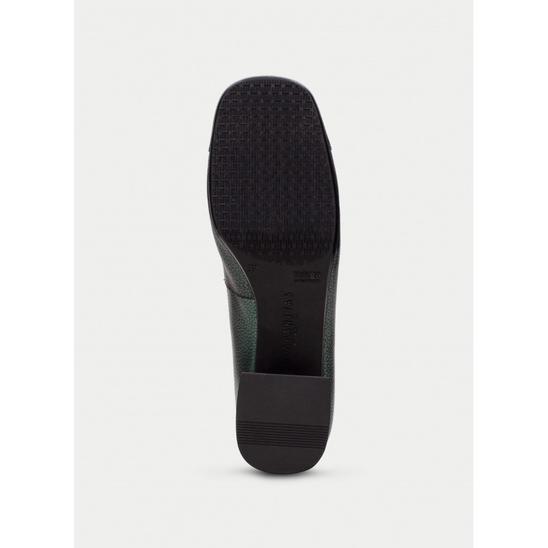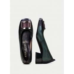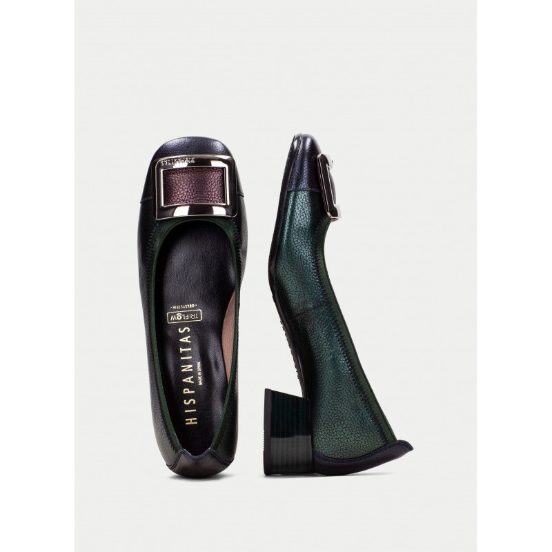 Bailarinas de tacon para mujer. Elaborada en piel con tacón bloque de 3 cm. Ribete elástico y adornode maxihebilla en la puntera. Este zapato incorpora la tecnología Triflow que amortigua cada paso aportando flexibilidad y confort en la pisada, gracias a su triple almohadillado.