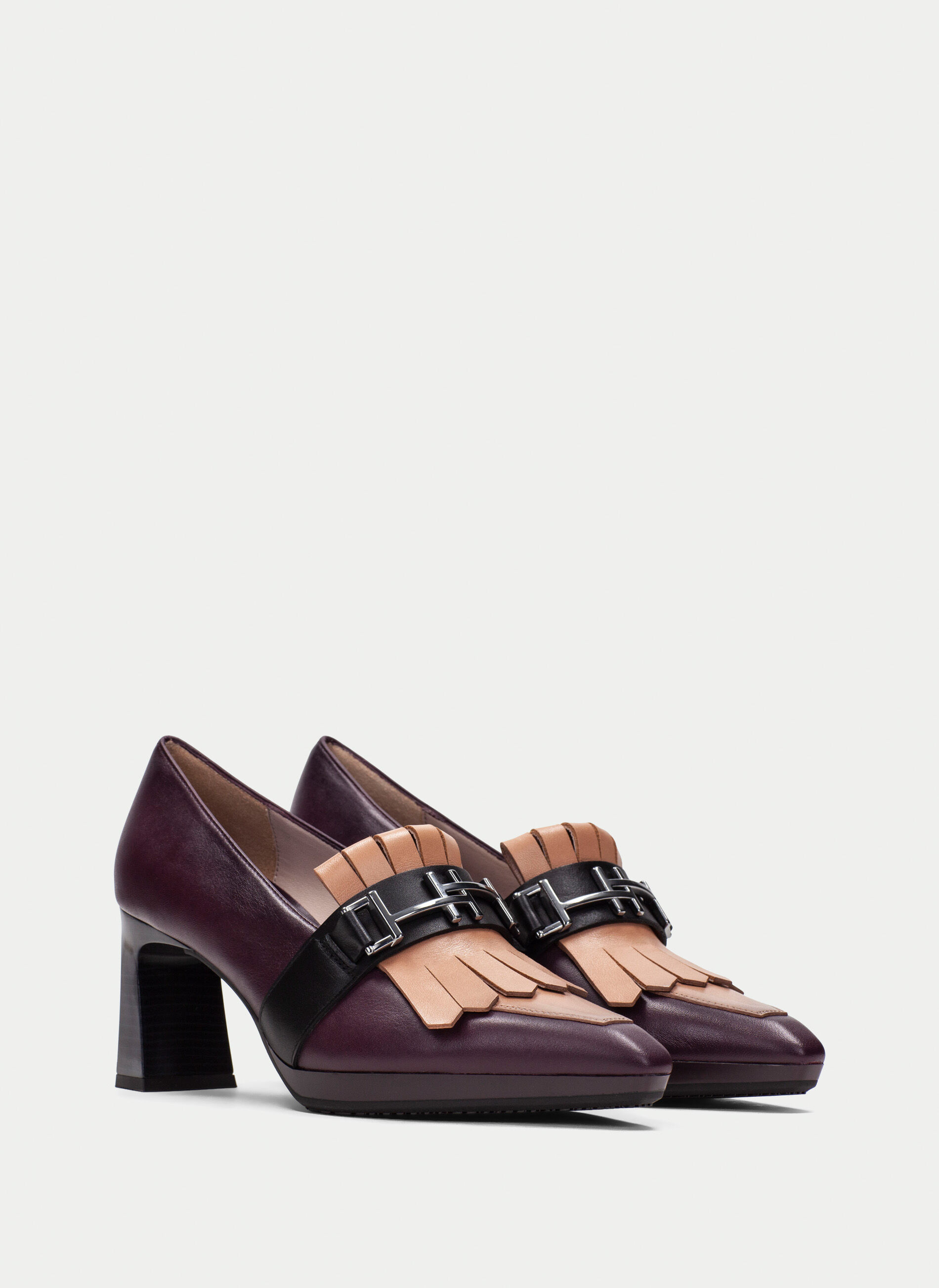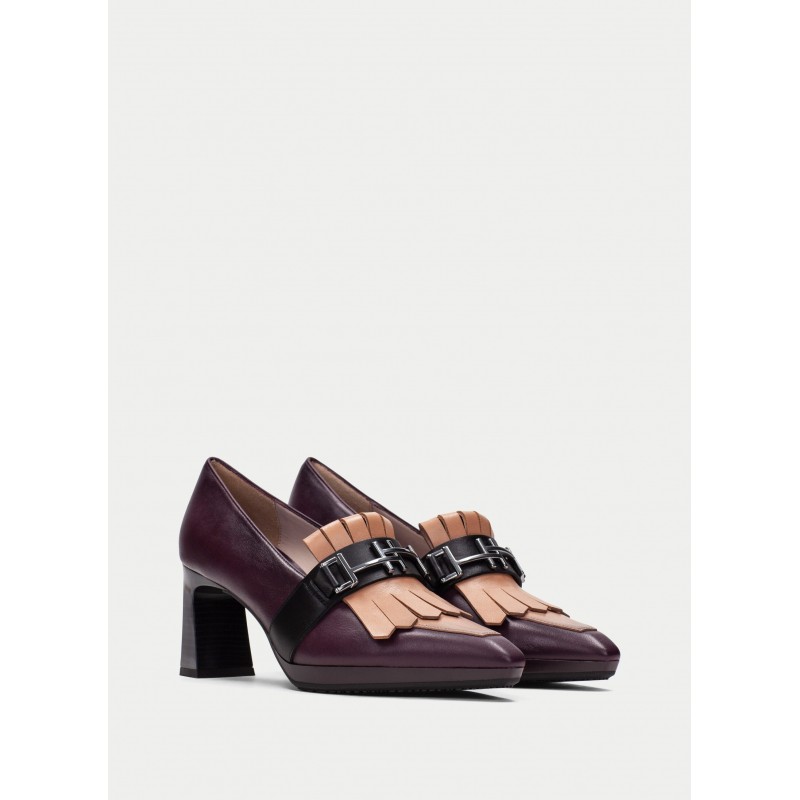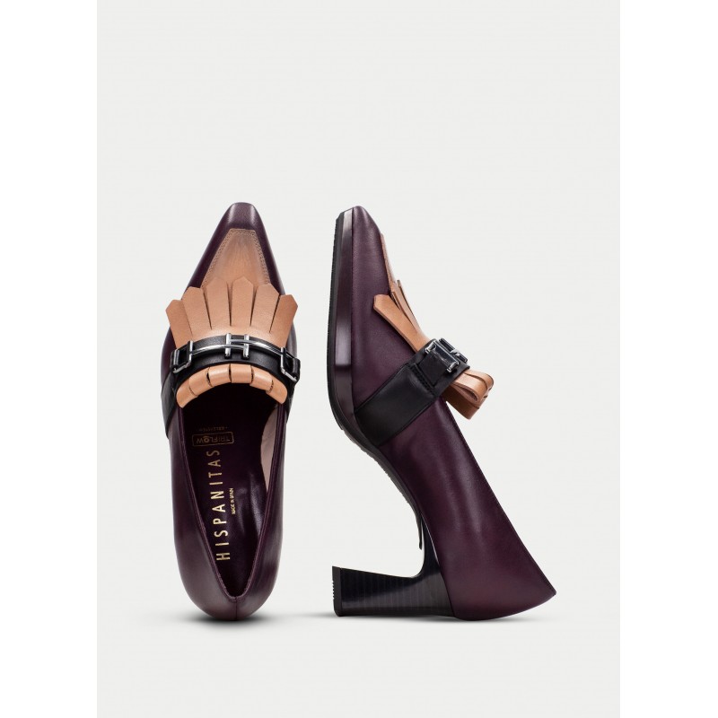 Salon de piel con tacon para mujer.Este modelo cuenta con el detalle de flecos en el empeine y maxihebilla en la parte frontal.