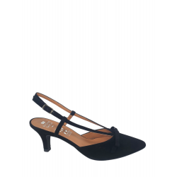 Sandalia ante para mujer de diseño de lazo en la parte del empeine, cierre al tobillo de hebilla y en punta de una altura de tacón de 6 cm.