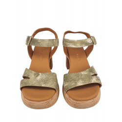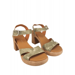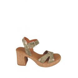 Sandalia tacón bloque y plataforma para mujer, con tiras anchas que cubren la parte delantera del pie, cierre de hebilla al tobillo ajustable, detalles del logo, plantilla confortable, suela de material que imita a la madera y exterior de goma para proporcionar un mejor agarre. Estas sandalias combinan estilo y confort, con una mezcla de materiales y acabados que las hacen llamativas y versátiles.