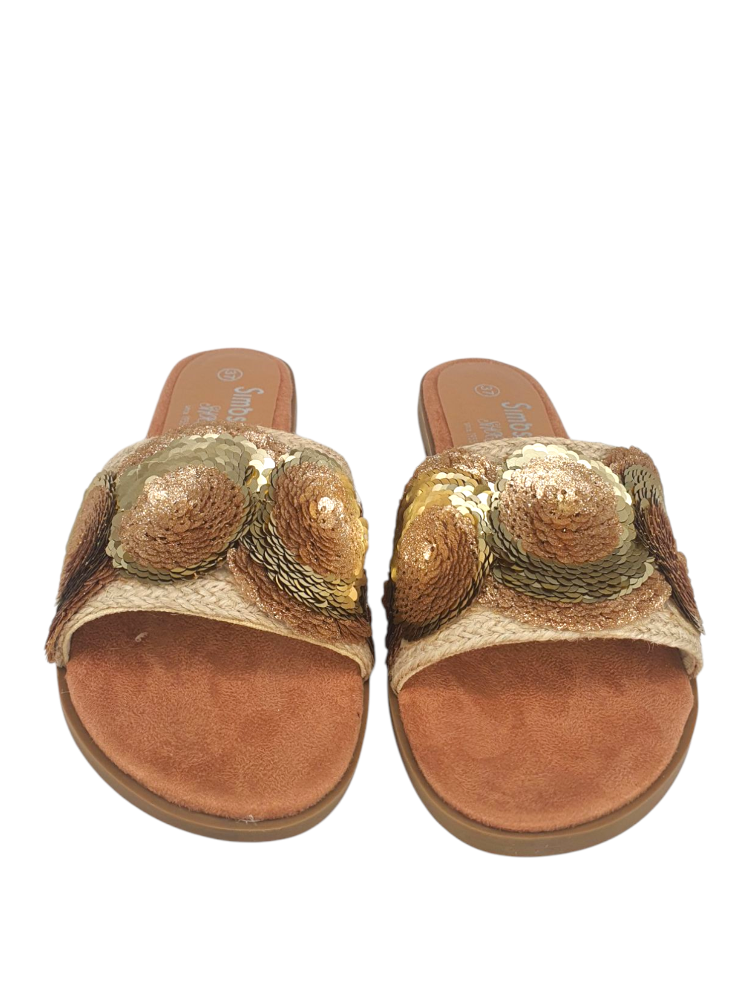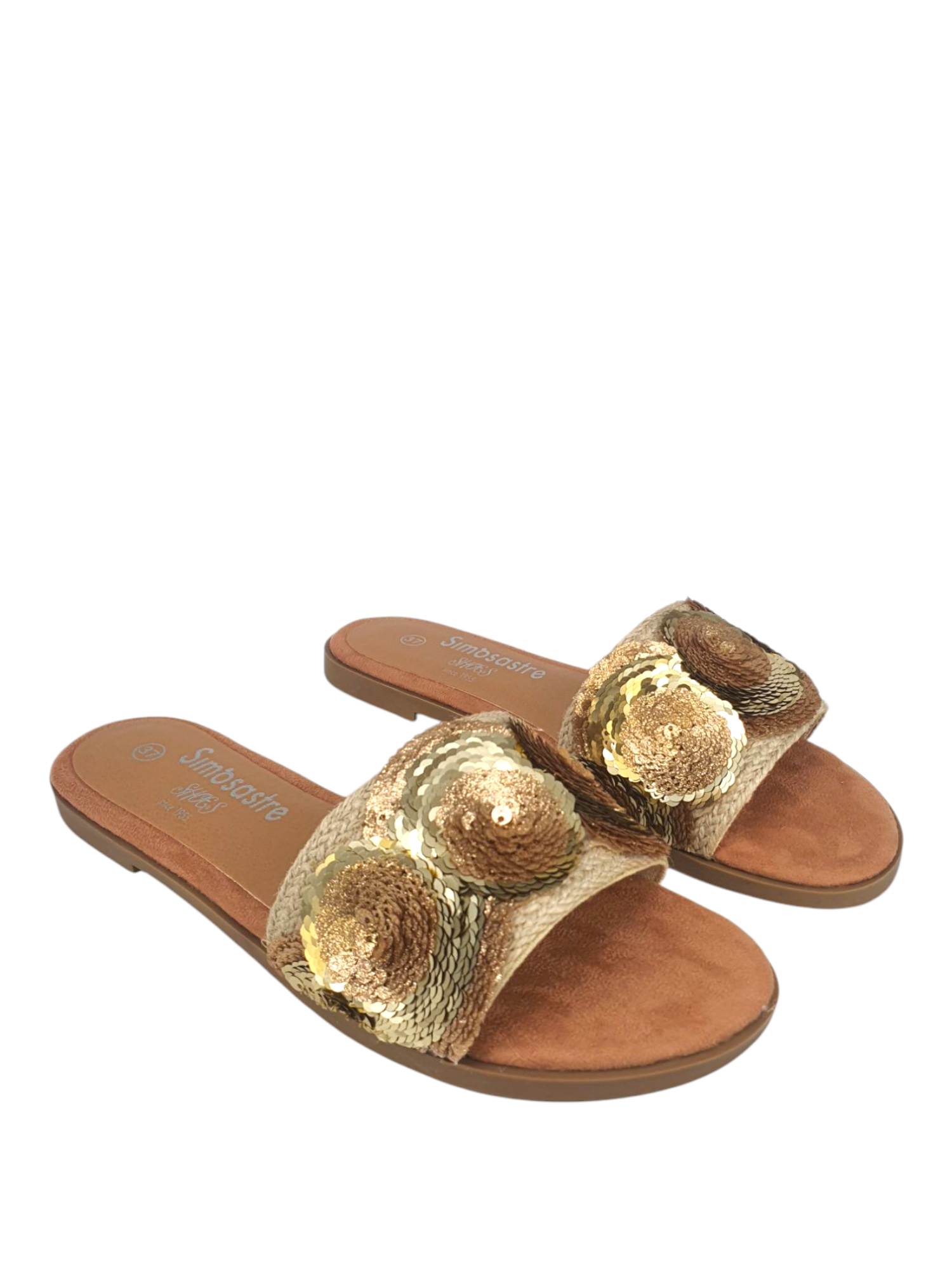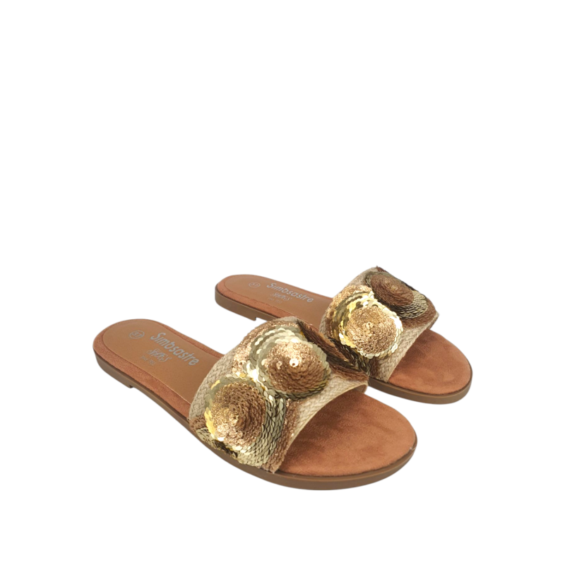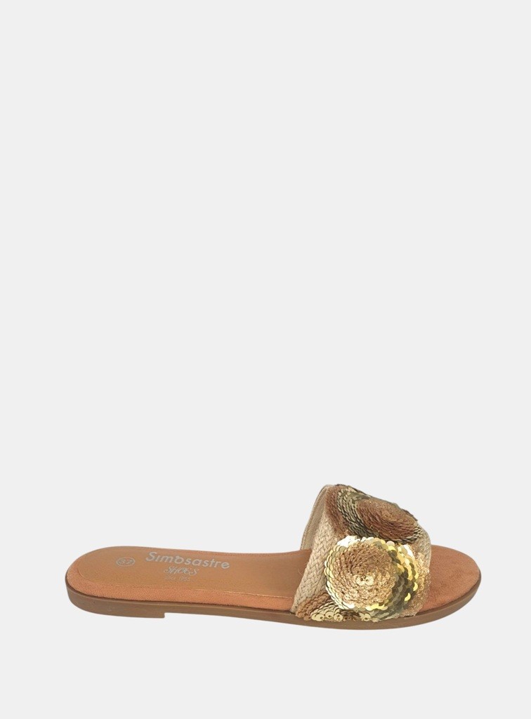 Sandalia plana para mujer.Tira adornada con una aplicación floral grande compuesta por lentejuelas doradas de diferentes tamaños. Ideales para ocasiones informales donde se quiera añadir un toque de brillo.