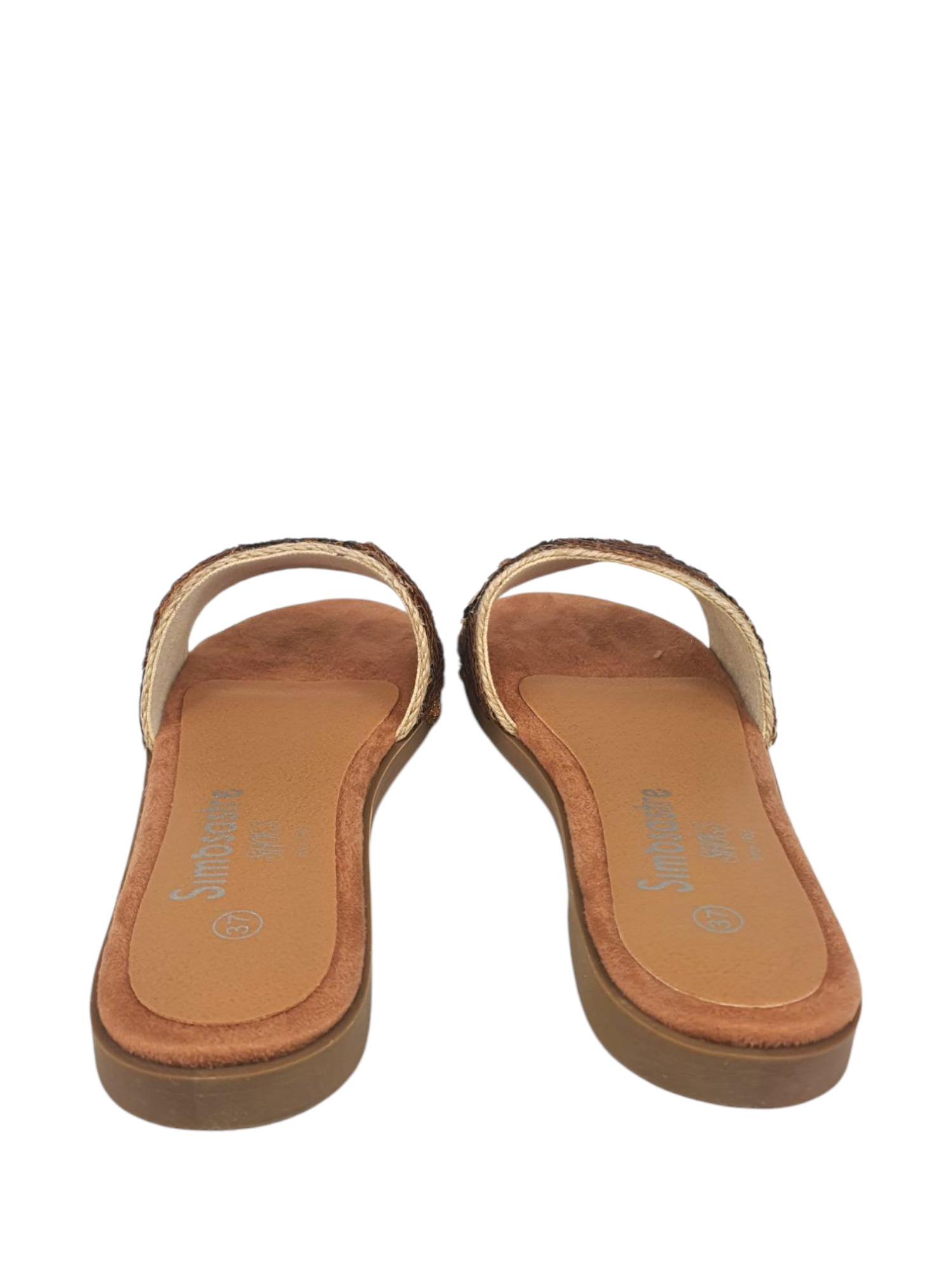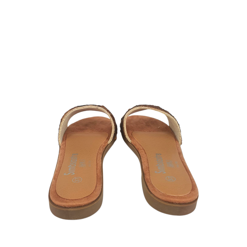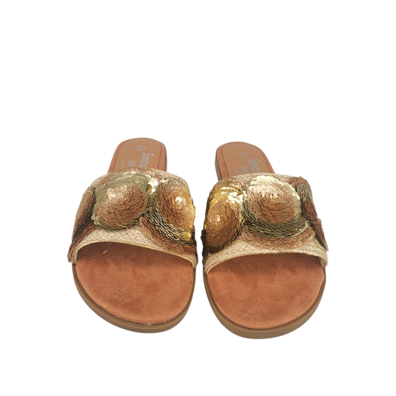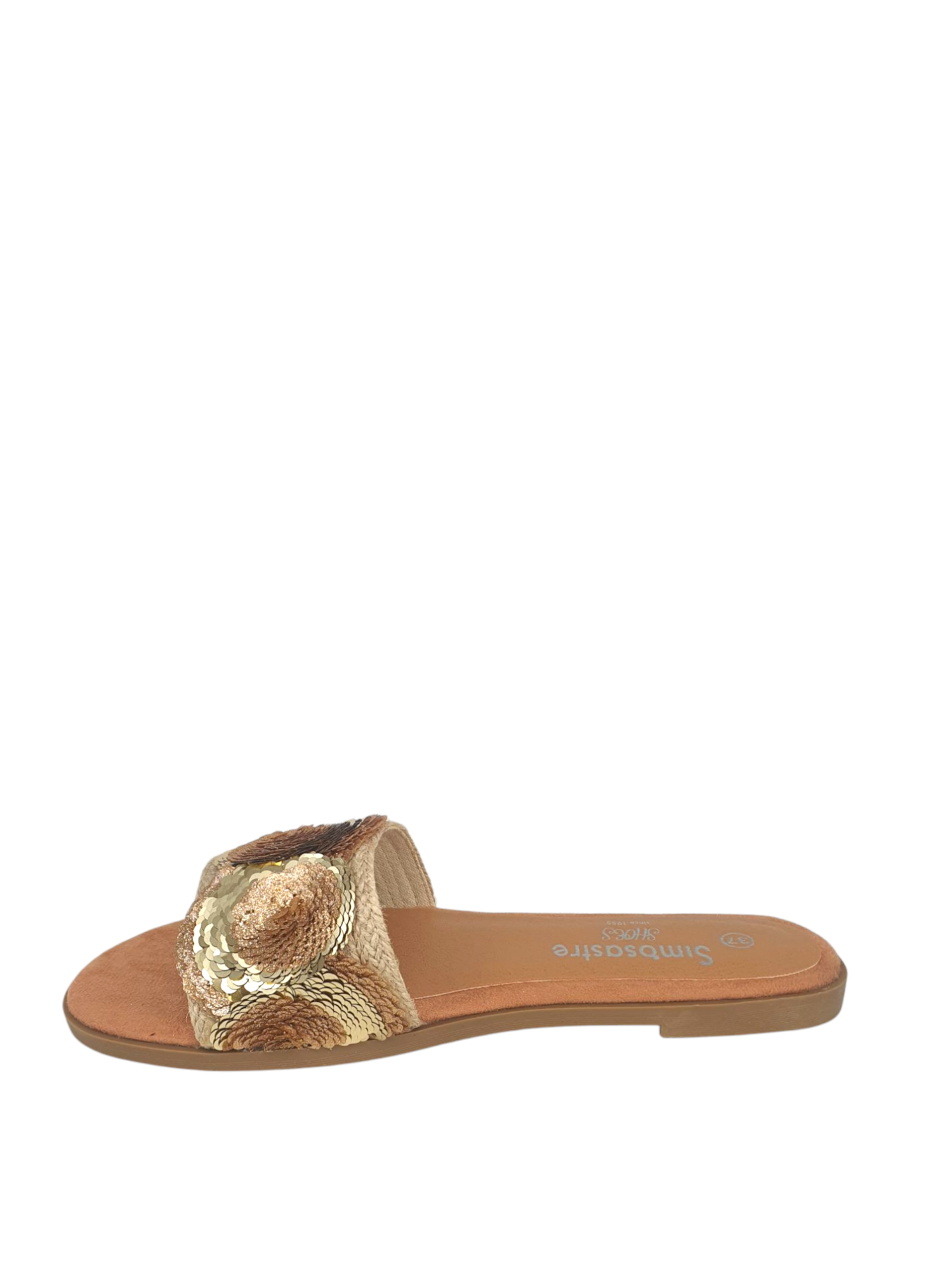 Sandalia plana para mujer.Tira adornada con una aplicación floral grande compuesta por lentejuelas doradas de diferentes tamaños. Ideales para ocasiones informales donde se quiera añadir un toque de brillo.