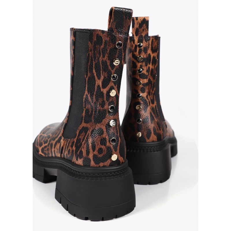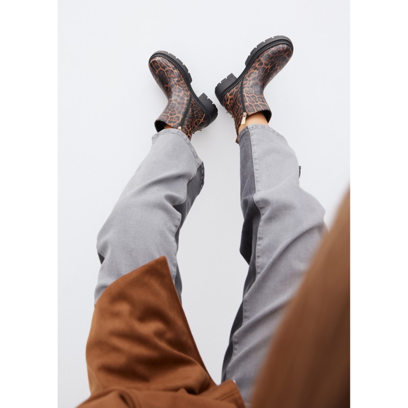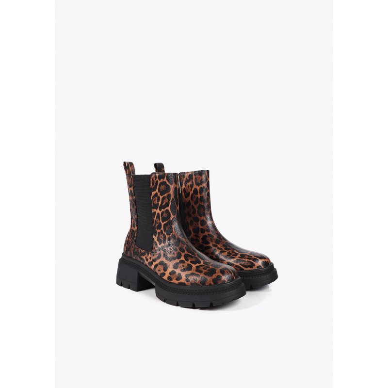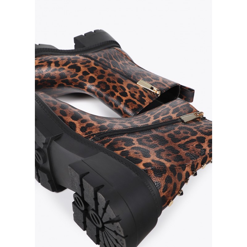 Botín con estampado animal para mujer. Suela track robusta que garantiza comodidad. Incorpora una tira con detalles metálicos en el talón. Diseño moderno y cierre lateral con cremallera para un ajuste perfecto.