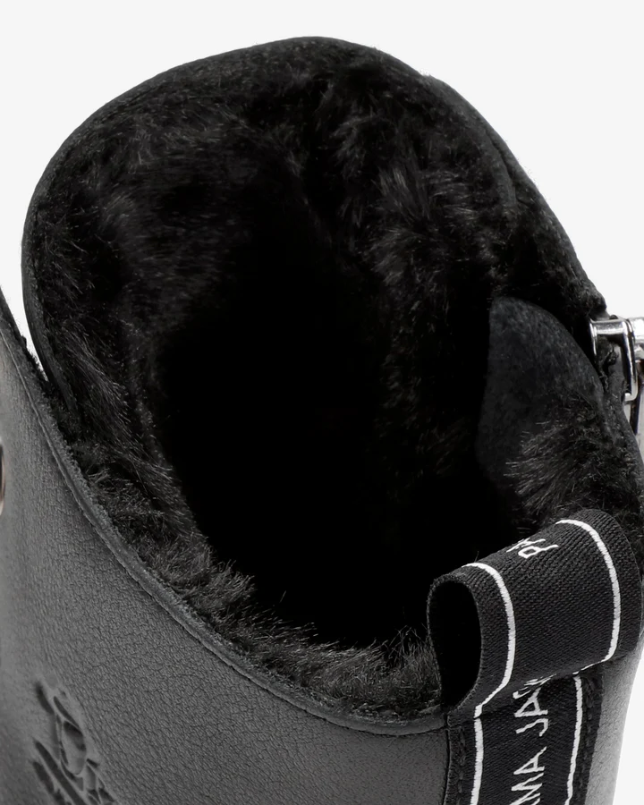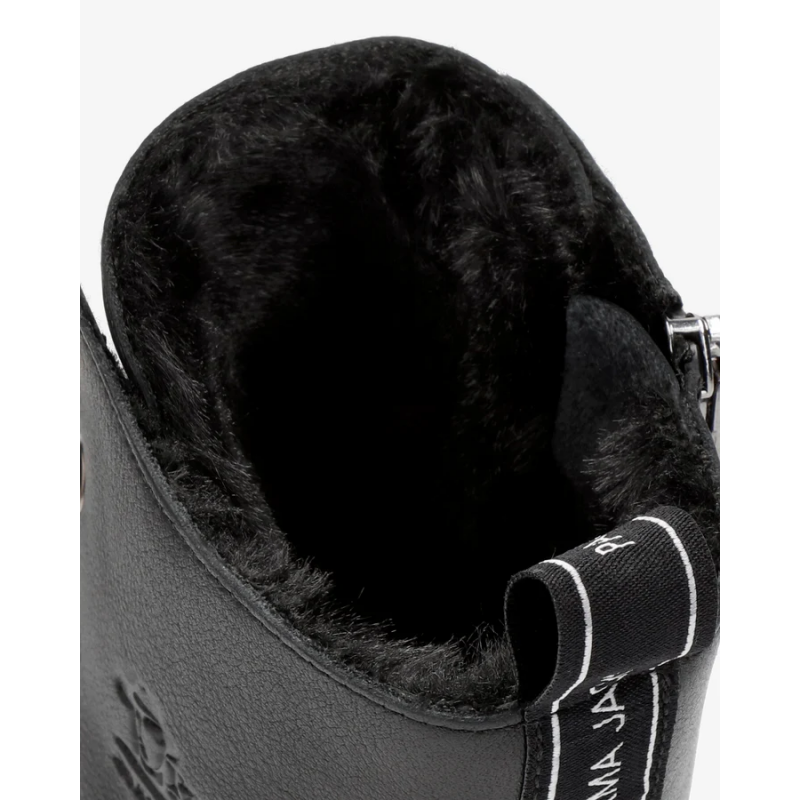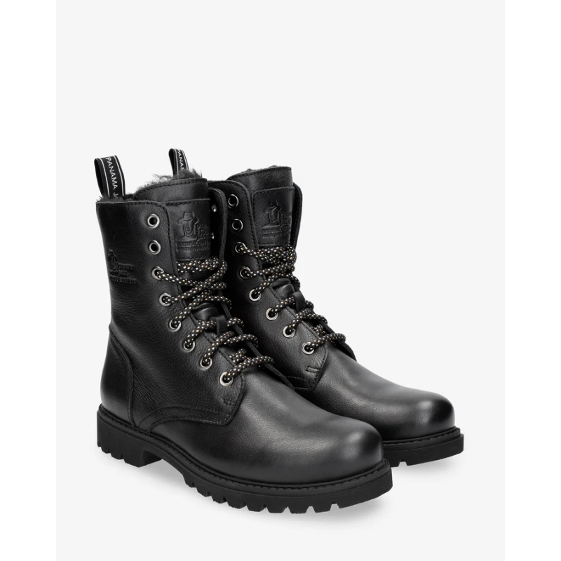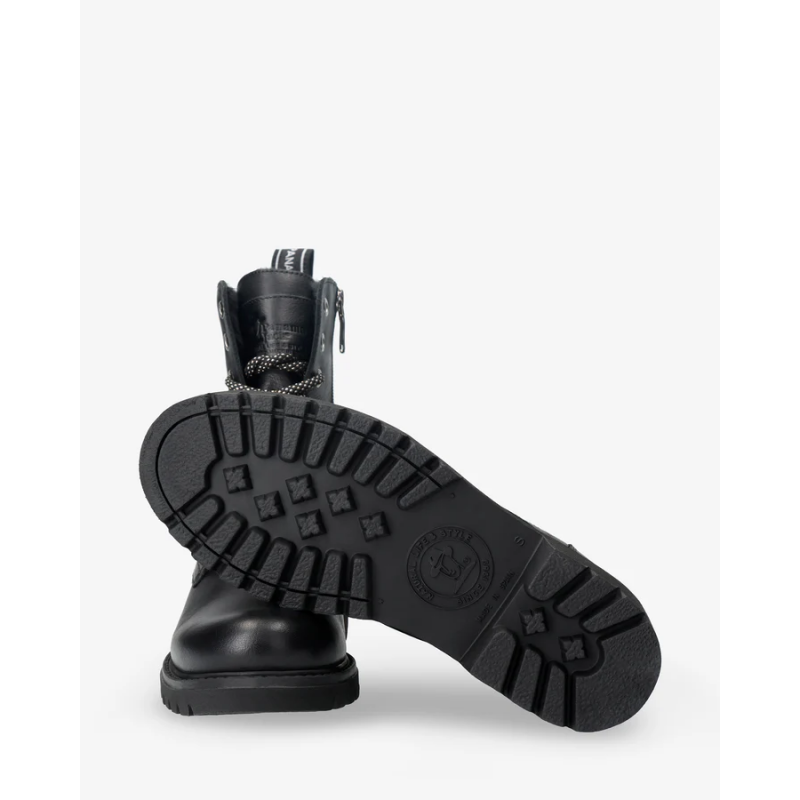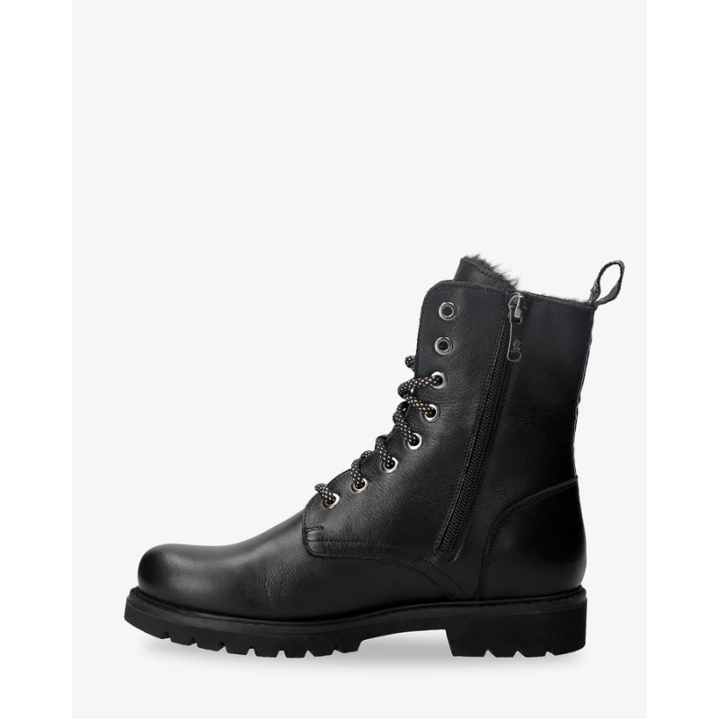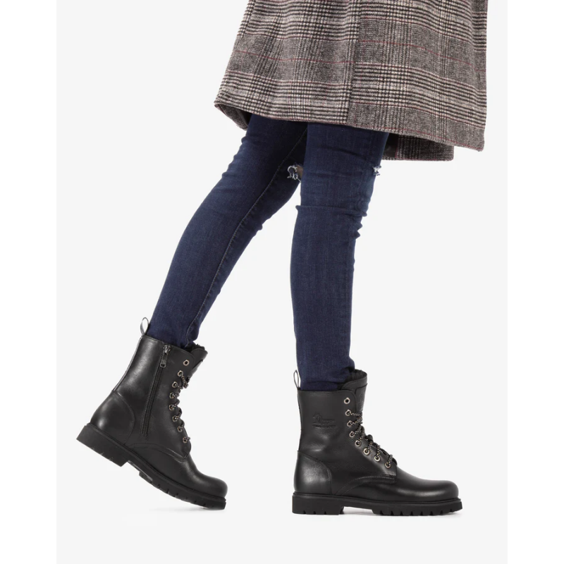 Botin de piel para mujer. Piel Napa Negro WATERPROOF. Cierre de cordones y cremallera. Forro interior de Pelo. Plantilla anatómica extraíble. Suela de caucho natural, flexible y resistente.