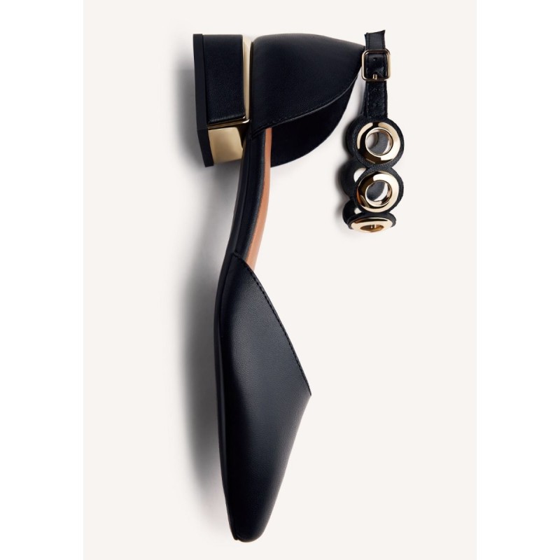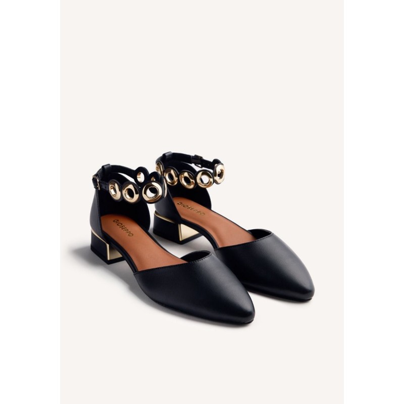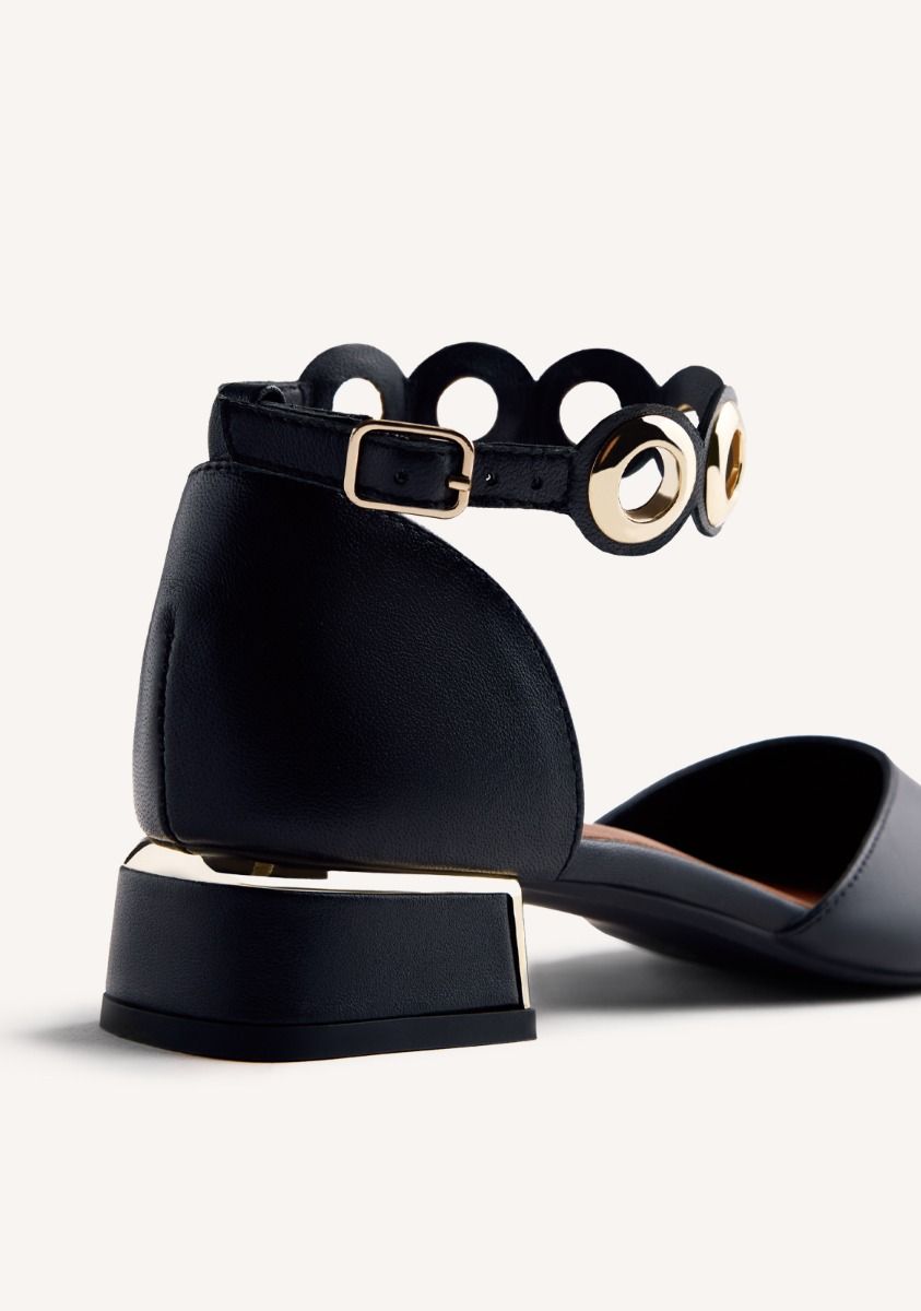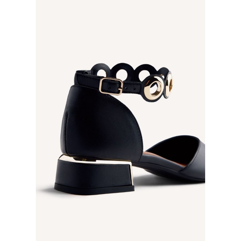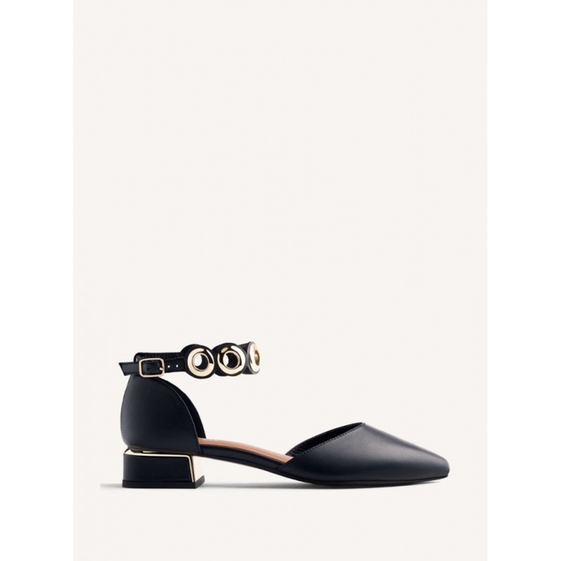 Bailarina de piel para mujer. Con ollados en acabado dorado. Cuentan con planta acolchada, tacón tipo bloque con pieza metalizada y cierres ajustables tipo pulsera.