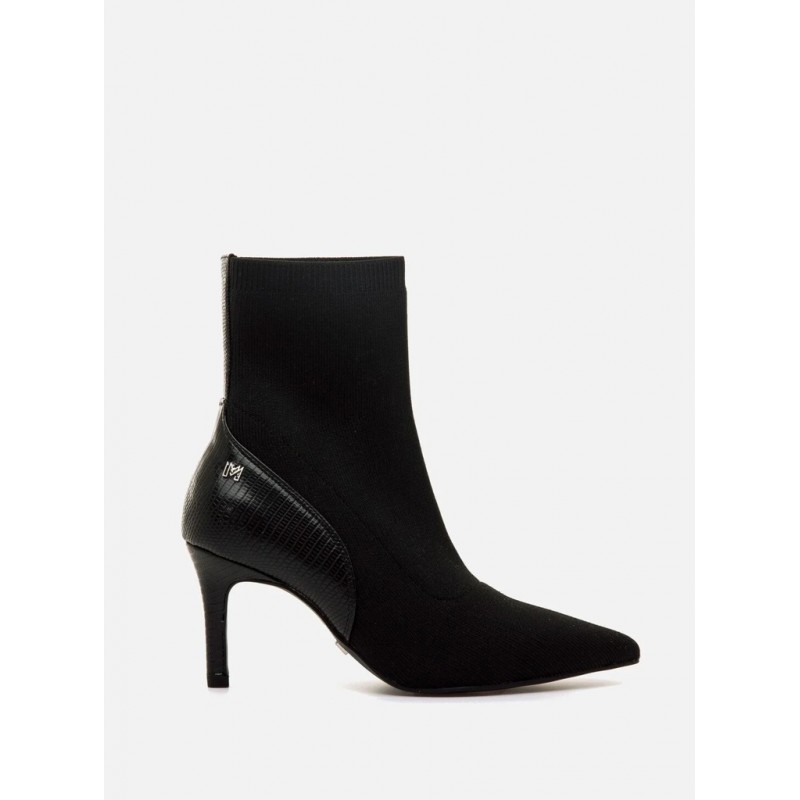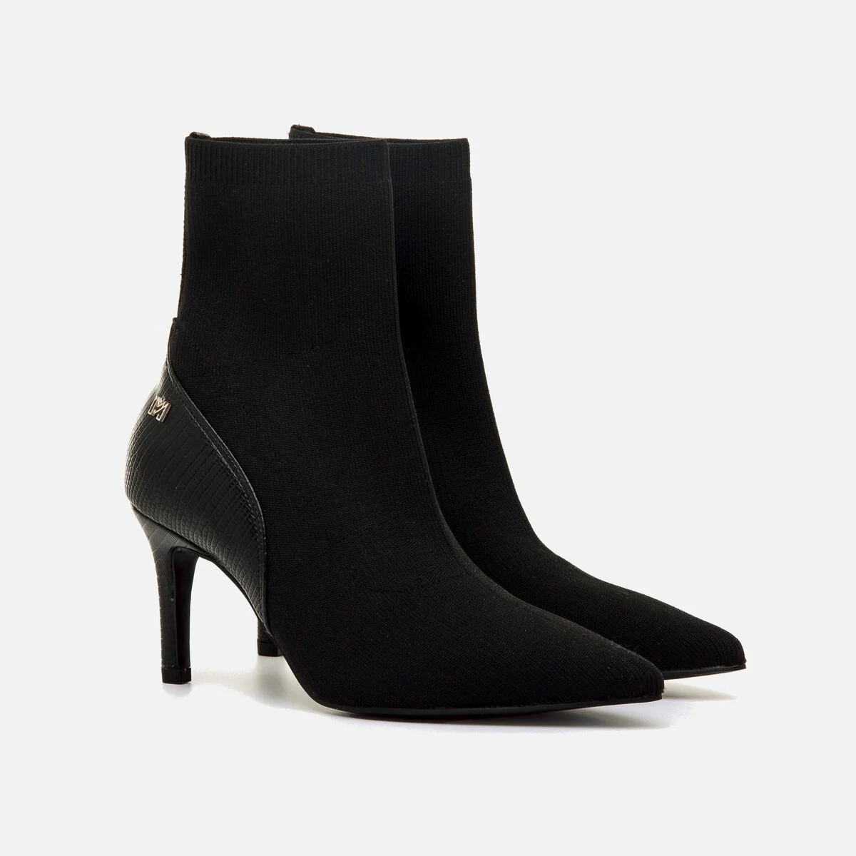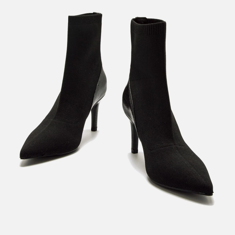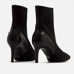 Botines de tacón para mujer. Con diseño tipo calcetín. Su ajuste elástico se adapta al pie y al tobillo, ofreciendo una sensación cómoda y estilizada. La puntera fina y el detalle texturizado en la parte trasera aportan un toque moderno y elegante.
