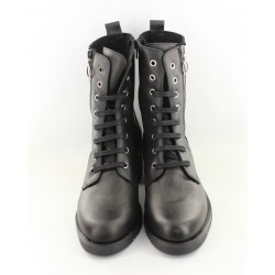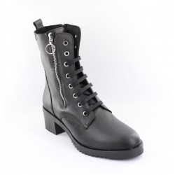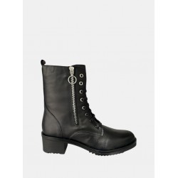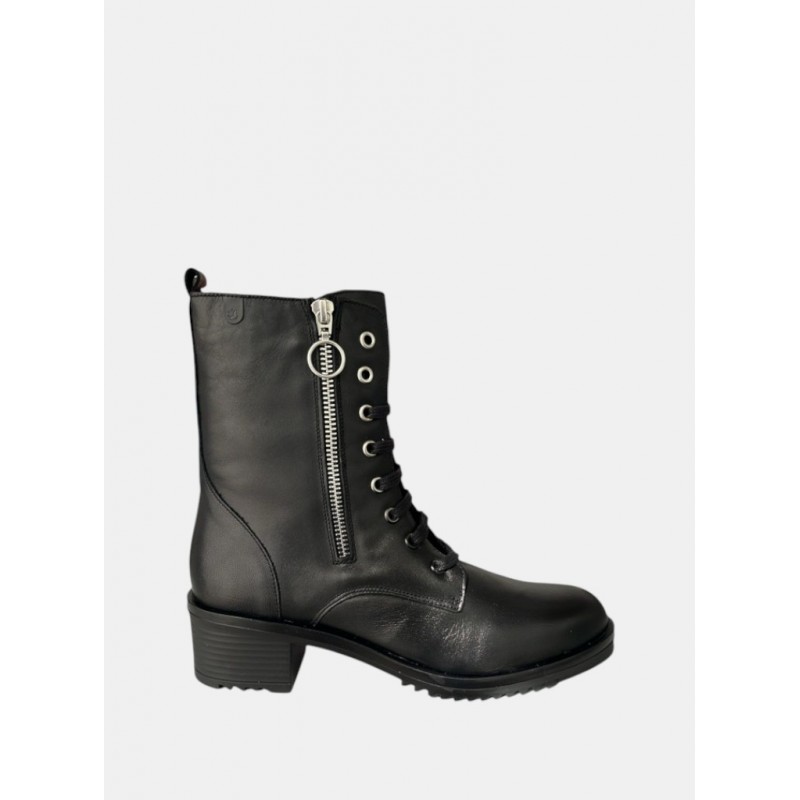 Botin de piel para mujer. Destaca su cierre de cremallera lateral con detalle de anilla, combinado con un sistema de cordones para un ajuste perfecto. La suela track y el tacón bajo aportan un toque de estilo militar y la máxima confort.