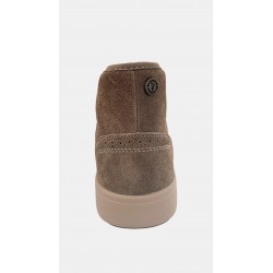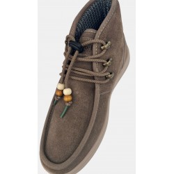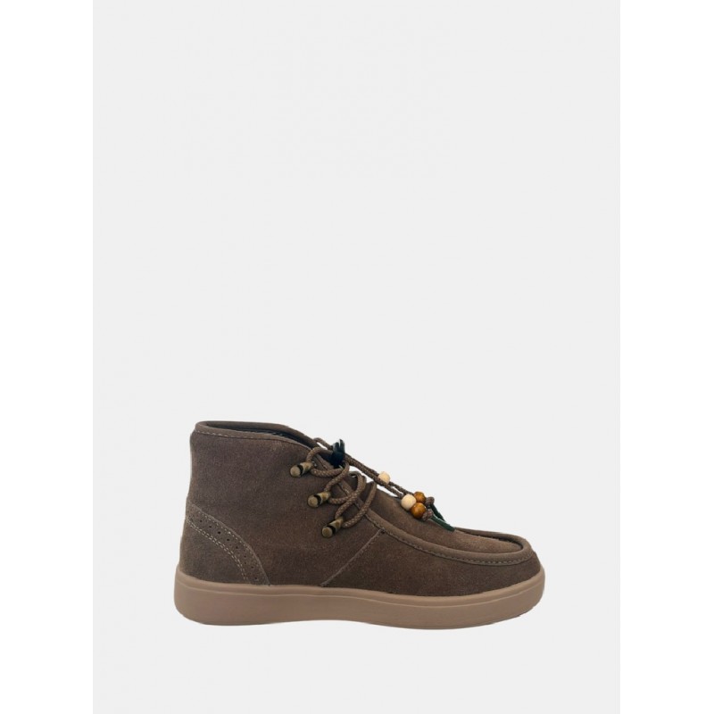 Botin en piel serraje ecológica para mujer. De caña media combinan estilo y sostenibilidad en un solo modelo. El detalle de los cordones con cuentas decorativas aportará un toque diferente a tus outfits diarios. Suela de EVA ultraligera con patín de goma antideslizante con madera reciclada.