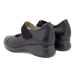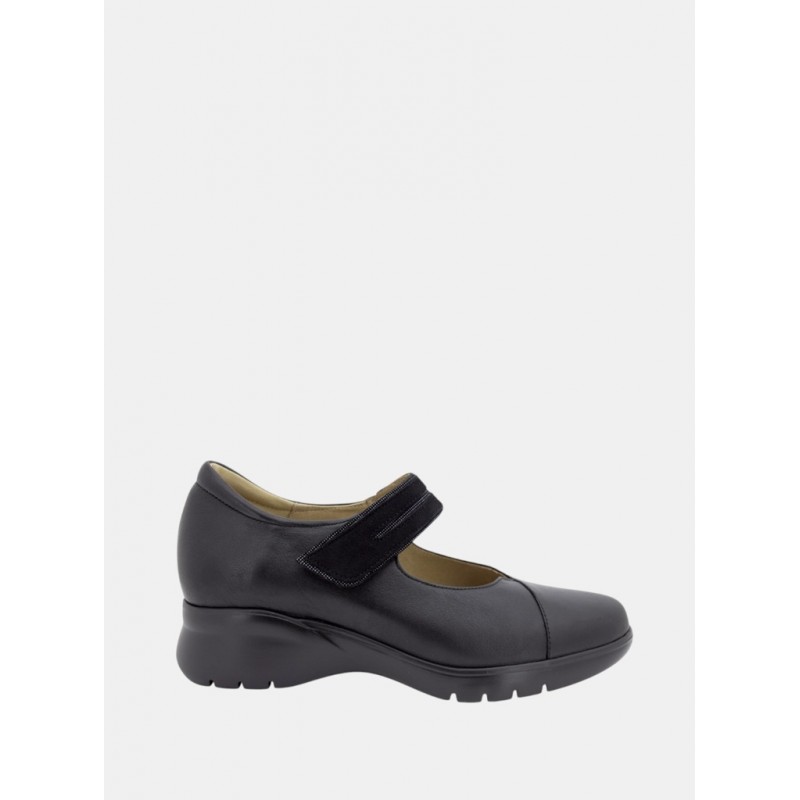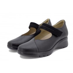 Zapato de piel para mujer. Con cierre de velcro para un ajuste perfecto y cómodo. Su cuña ligera y estable facilita caminar sin esfuerzo, ideal para pies delicados o anchos.