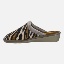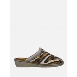 Zapatillas de casa para mujer. Estampado animal print. Destalonado. Con ribete de pelo. Piso de goma con ligera cuña de 4 cm de altura.